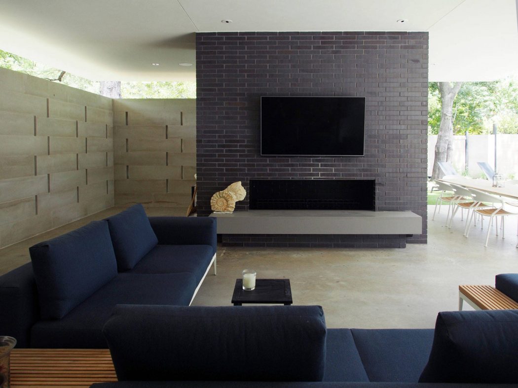 Transitioning to the outdoor living area, the design blurs the line between inside and out. Here, a covered lounge area presents a seamless space for relaxation, anchored by the dark tones of the brick fireplace wall.