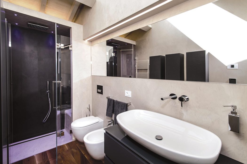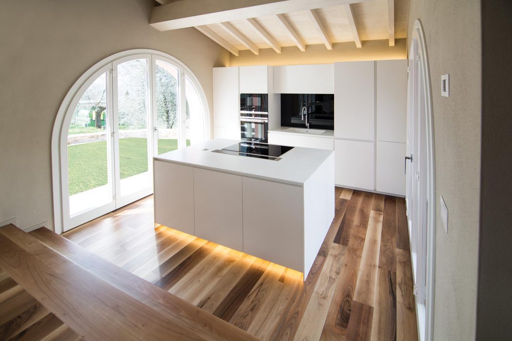 The kitchen features a minimalist design by Ernesto Meda, highlighted by a total white theme and a thin Corian top for the freestanding island. Whitened exposed beams add a touch of light, contrasting with the colorful resin-coated bathrooms equipped with fixtures from Italian design brands like Flaminia and Globo.