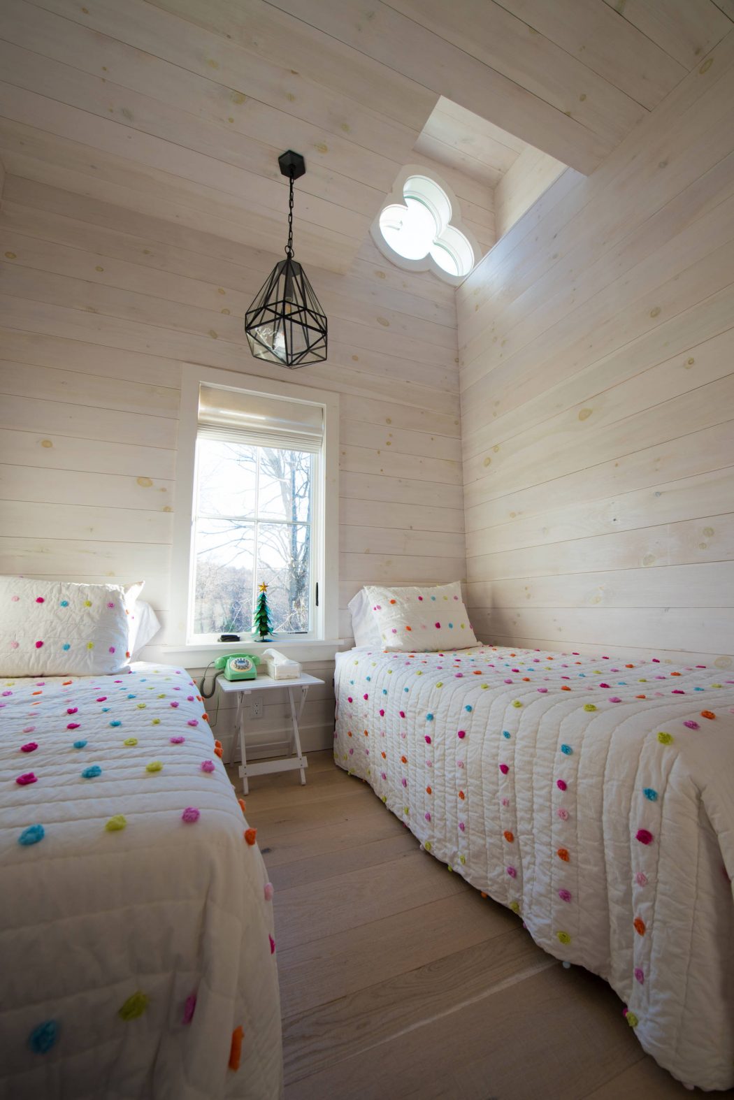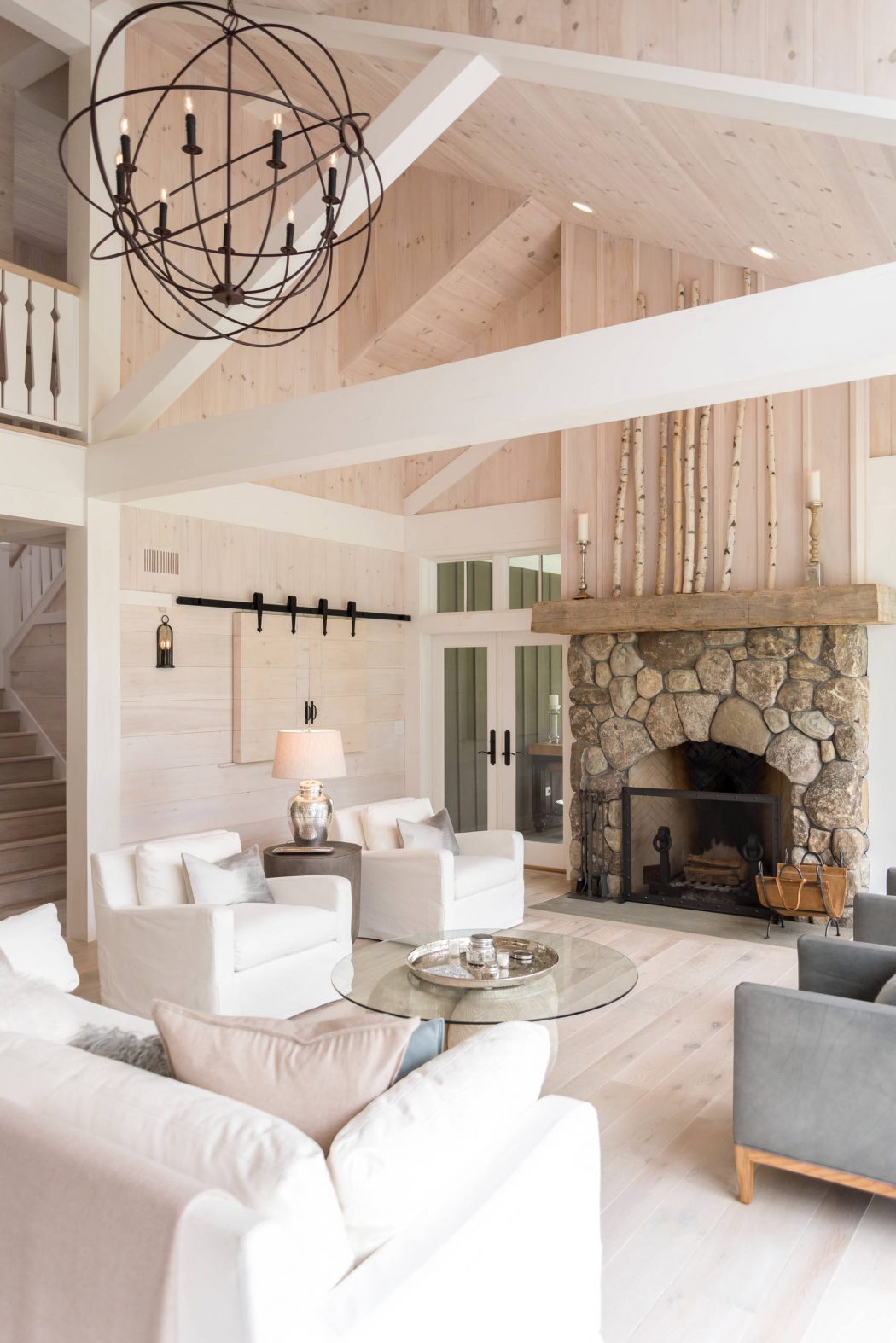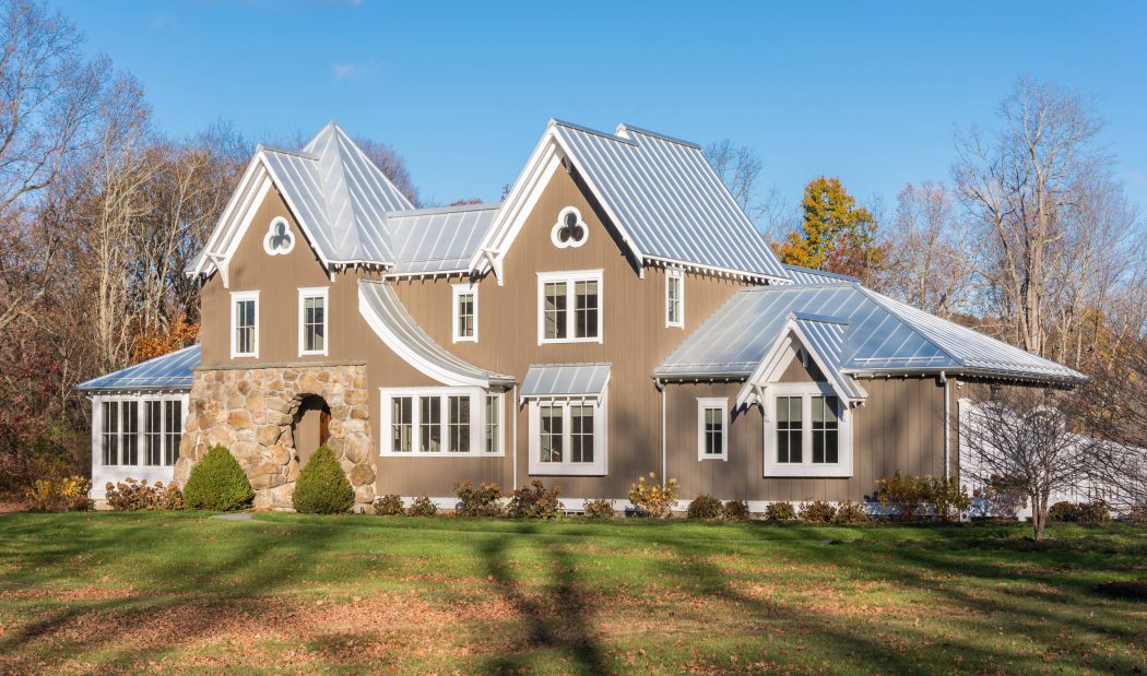 The home’s exterior features strikingly steep roofs and clover-shaped windows, paying homage to the carpenter gothic style prevalent in the area. The metal roof mirrors the sky, adding a light, airy feel that contrasts beautifully with the stone base of the entrance. Graceful arches soften the overall roofline, while a gracefully curving fence extends the front elevation, enhancing the home’s presence.