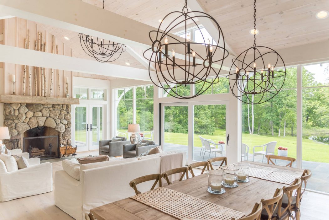 The design heavily draws on the surrounding landscape. Daniel Contelmo strategically positioned the house to make the most of the pastoral views. On one side, large windows frame a meadow, and at the back, nearly all-glass walls offer panoramic views of a pond, ensuring nature is always a glance away.