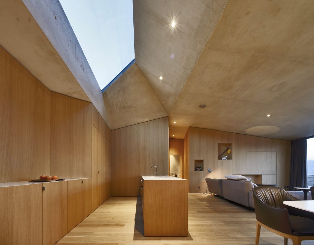 A staircase serves as the physical and symbolic link between the past and present, connecting the historic and modern sections of the home. The material selection—natural stone, exposed concrete, steel, and wood—reflects this bridging of eras, harmonizing with the natural landscape. The exposed concrete ceiling, for instance, mirrors the hilltop’s contour removed during construction, while the extensive use of wood and classic surfaces adds warmth.