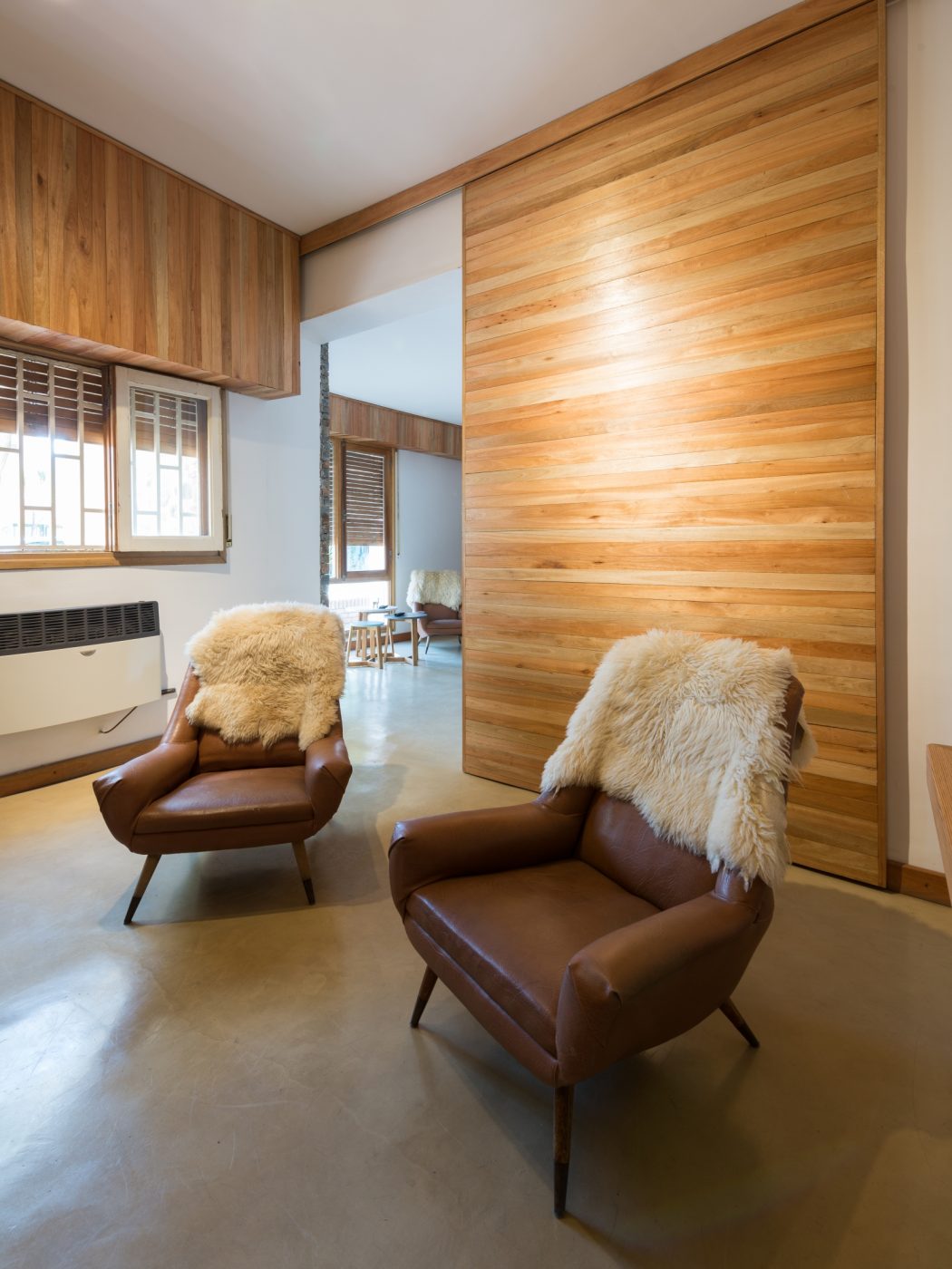 Natural light floods the kitchen, thanks to large glass doors that offer a view of the outdoors. The open plan ensures that even as you cook, you remain part of the conversation. Stepping further, the continuity of wooden paneling creates a cozy corner with plush armchairs—a perfect nook for reading or enjoying a quiet moment.