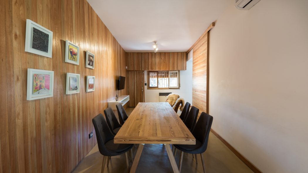 As you step inside, the blend of traditional materials and modern fixtures immediately grabs your attention. The dining area, with its robust wooden table and comfortable chairs, invites family gatherings. Wood-paneled walls radiate warmth, while the sleek TV adds a touch of contemporary convenience.