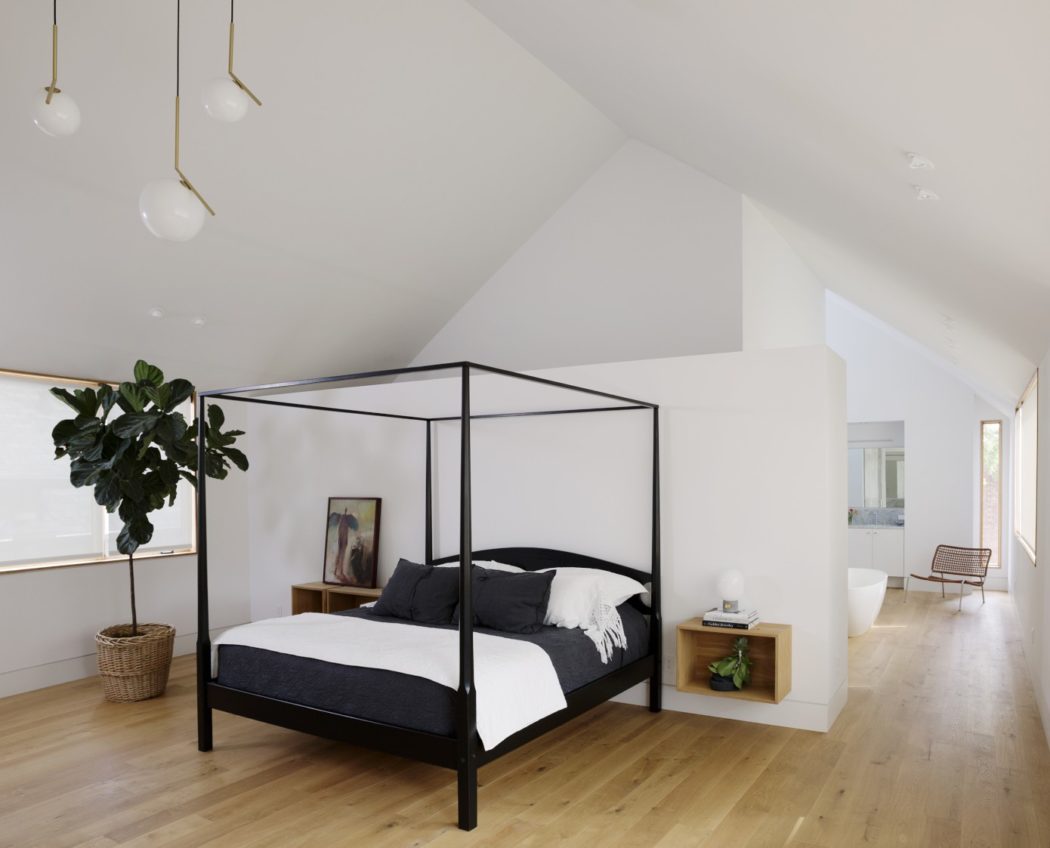Each bedroom in Family HQ is a testament to restrained elegance. The master suite, with its pitched ceiling and plush textiles, offers a sanctuary of serenity. In contrast, the guest bedrooms blend practicality with a sense of welcoming warmth, utilizing soft lighting and subtle art to create a restful ambiance.