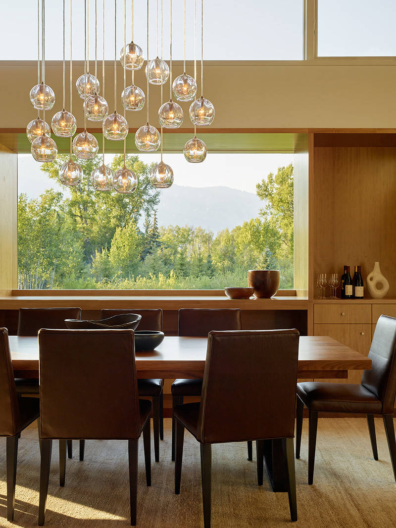 Adjacent to the living space, the dining area dazzles with a constellation of pendant lights, reflecting off a grand table set for a gathering of minds or a family feast. Here, the outside world becomes a panoramic backdrop to shared meals and memories in the making.