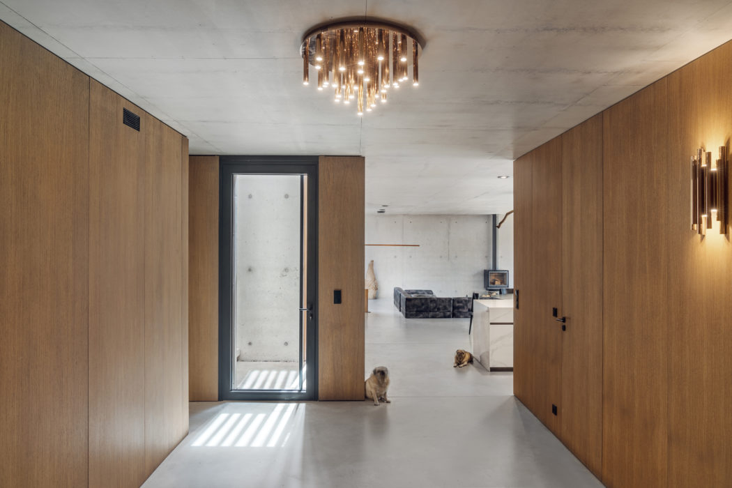 The garage’s structure contrasts the concrete with its lightweight wooden frame and larch façade, harmonizing with the roof’s green expanse of herbs and stonecrops. Inside, oak finishes add warmth to the interiors. Sustainability shines through in the home’s mechanical ventilation with heat recovery and an efficient underfloor heating system. The latter benefits significantly from the thermal mass of the concrete slab floors, underscoring the project’s commitment to eco-friendly design principles.