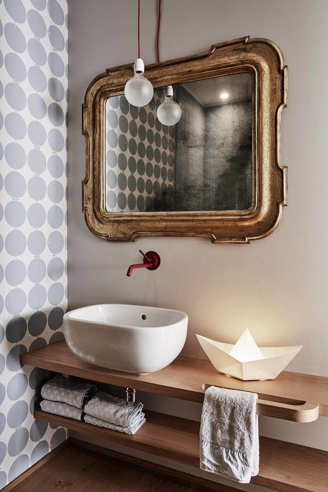 The transition to the bathroom reveals a harmonious blend of classic and contemporary styles. A vintage mirror juxtaposes with modern geometric wallpaper, creating a dynamic and intriguing space. The simplicity of the fixtures emphasizes functionality without sacrificing style, and the pop of red from the faucet acts as a bold statement piece.