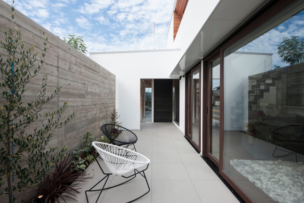 A step closer reveals an inviting wooden deck, suggesting seamless indoor-outdoor living. Flanked by lush greenery, the deck serves as a prelude to the home’s intimate connection with nature. Nearby, a private courtyard nestled between the home’s wings offers a tranquil spot for reflection, embraced by the subtle textures of concrete walls.
