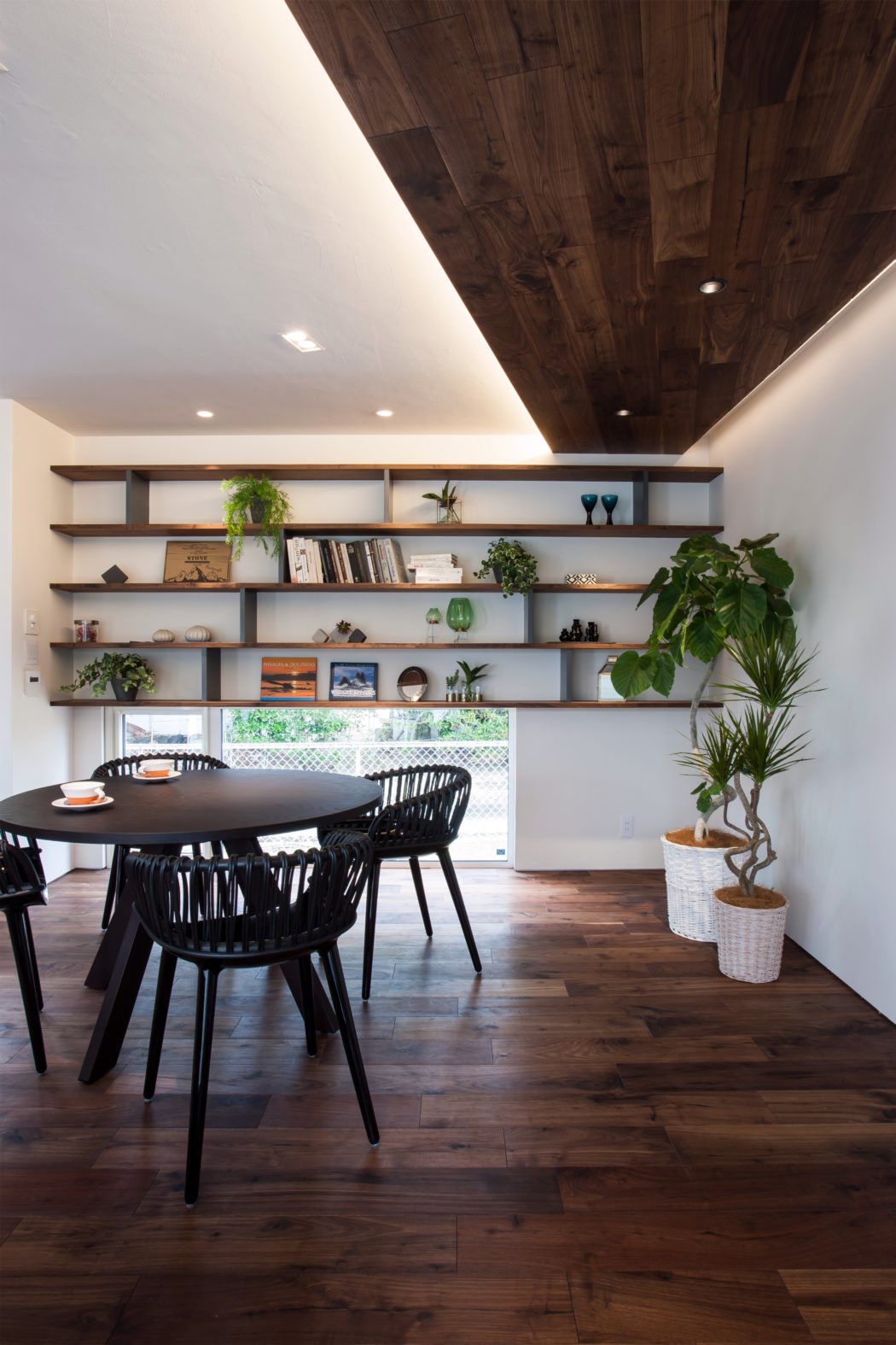 Inside, the living room welcomes guests with its plush seating and wooden details that echo the exterior’s warmth. As one moves to the dining area, the seamless design language continues with a sleek black table and shelves curated with personal artifacts. Here, family and friends gather, surrounded by views framed by the expansive windows.