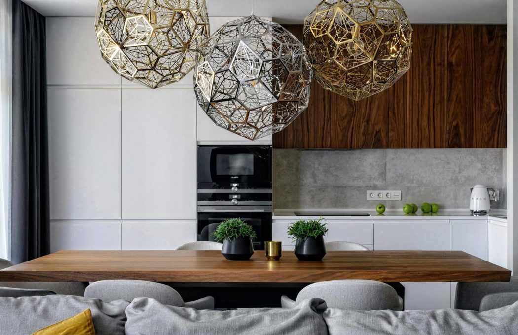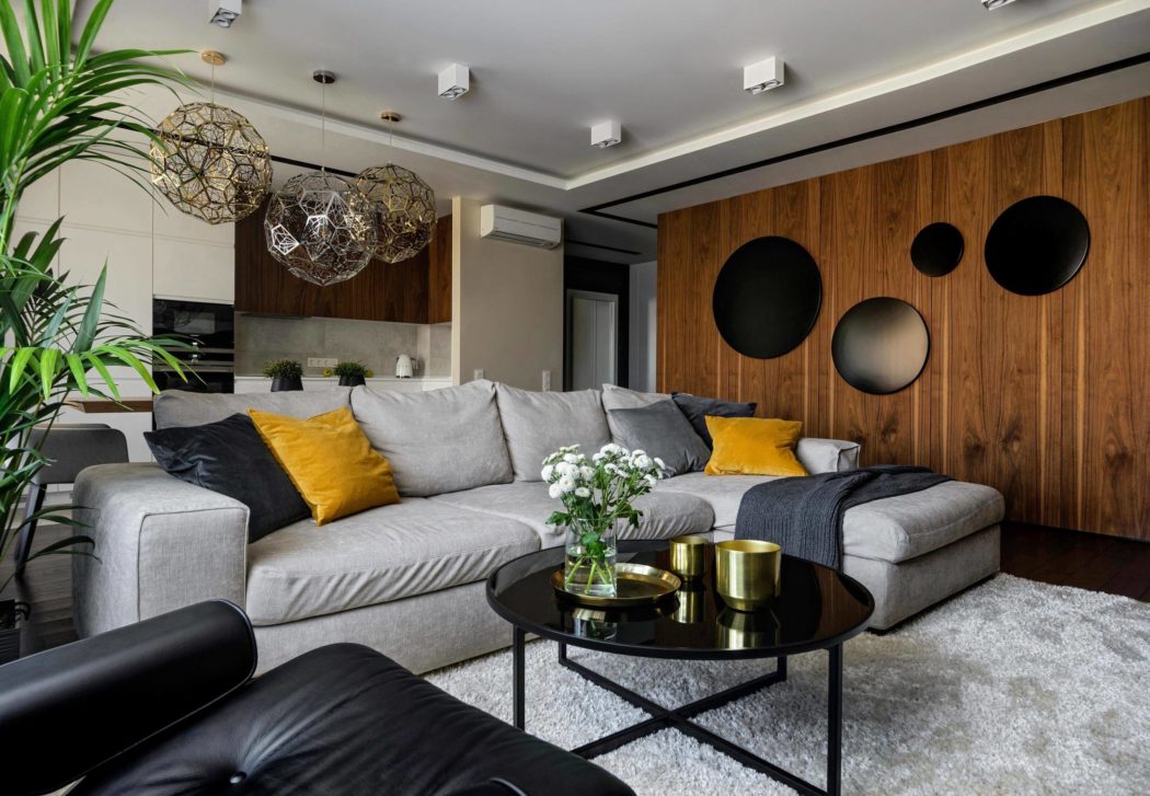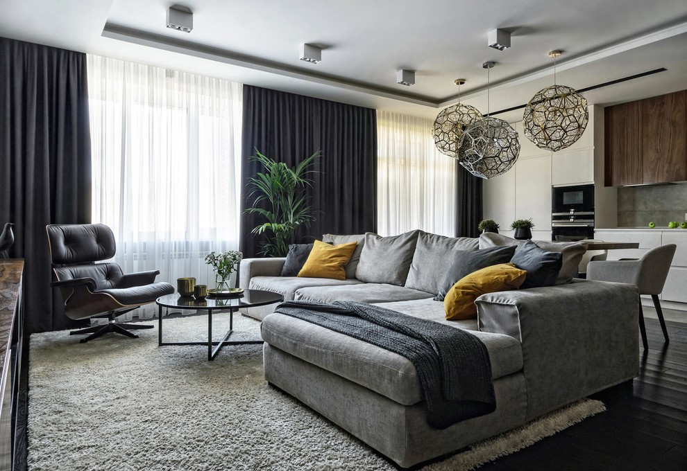 Upon entry, the living room greets visitors with a symphony of gray and wood tones. Geometric light fixtures cascade overhead, casting a warm glow on the plush, oversized sofa adorned with pops of mustard. The space balances comfort and style, inviting one to unwind or entertain.