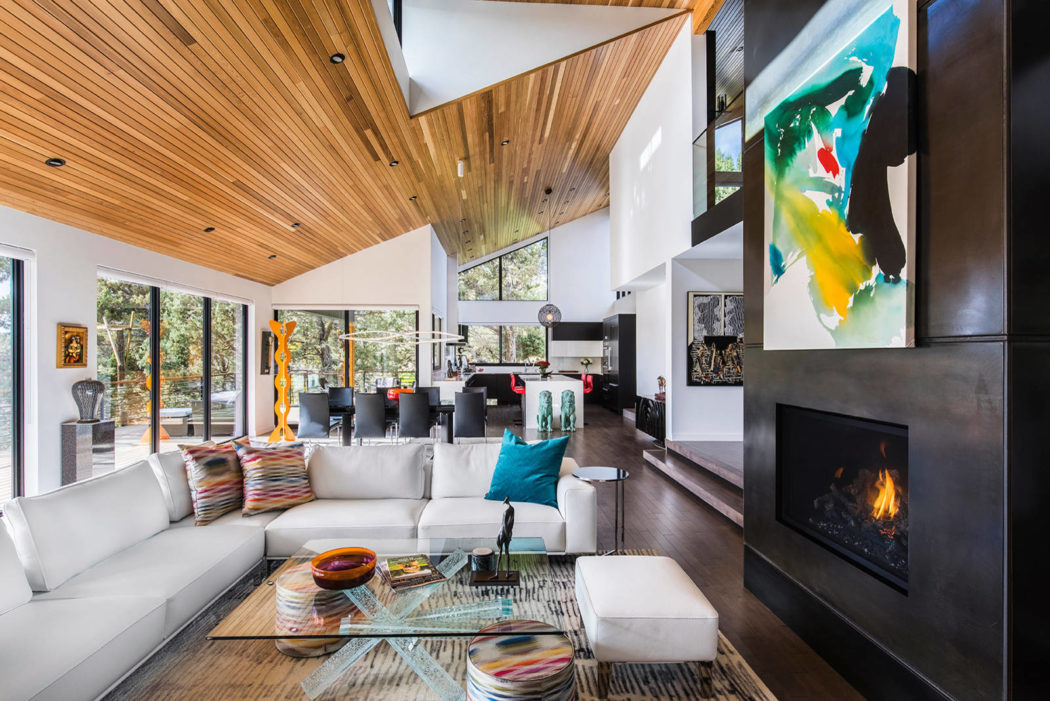 Transitioning inside, the living room greets visitors with its soaring ceilings, adorned with rich wooden beams that draw the eyes upward. The fireplace, a centerpiece of steel and warmth, invites a communal gathering, while contemporary art provides splashes of color against the minimalist walls.