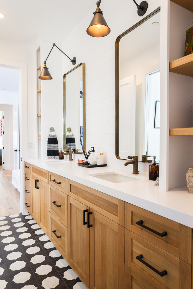 The heart of the home, the kitchen, balances functionality with flair. Here, the designer’s touch shines through open shelving adorned with curated décor and a spacious island that invites social cooking experiences.