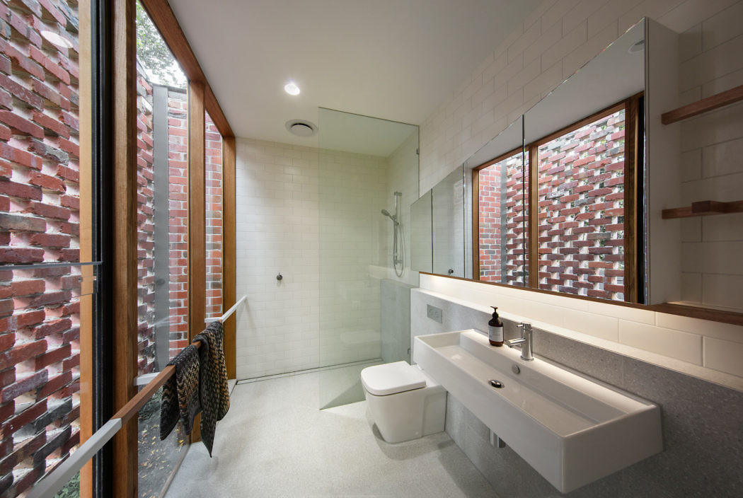 Two strategically placed hit-and-miss brick walls encircle this open area, serving both as a shade for the western sun and as privacy screens for the robe, bathroom, and living areas. These walls not only offer functional benefits but also deepen the appreciation for the brick material and the home’s distinct character and legacy.