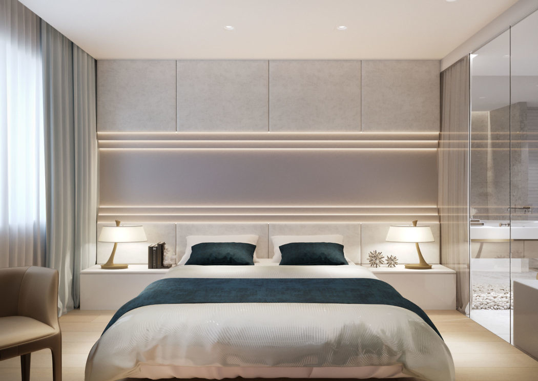 In the private quarters, the master bedroom reveals a sanctuary of serenity. Clean lines lead the eye to the en-suite bathroom, visible through a glass partition, marrying the spaces with a visual breath of transparency. Textured walls lend a tactile dimension to the room, harmonizing with the soft lighting that guides you through the space.