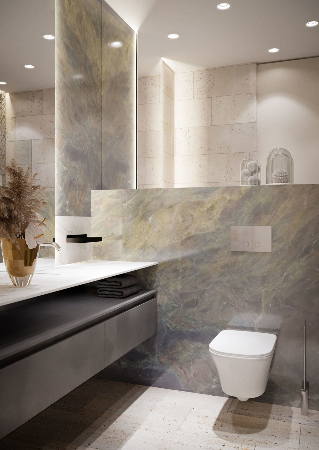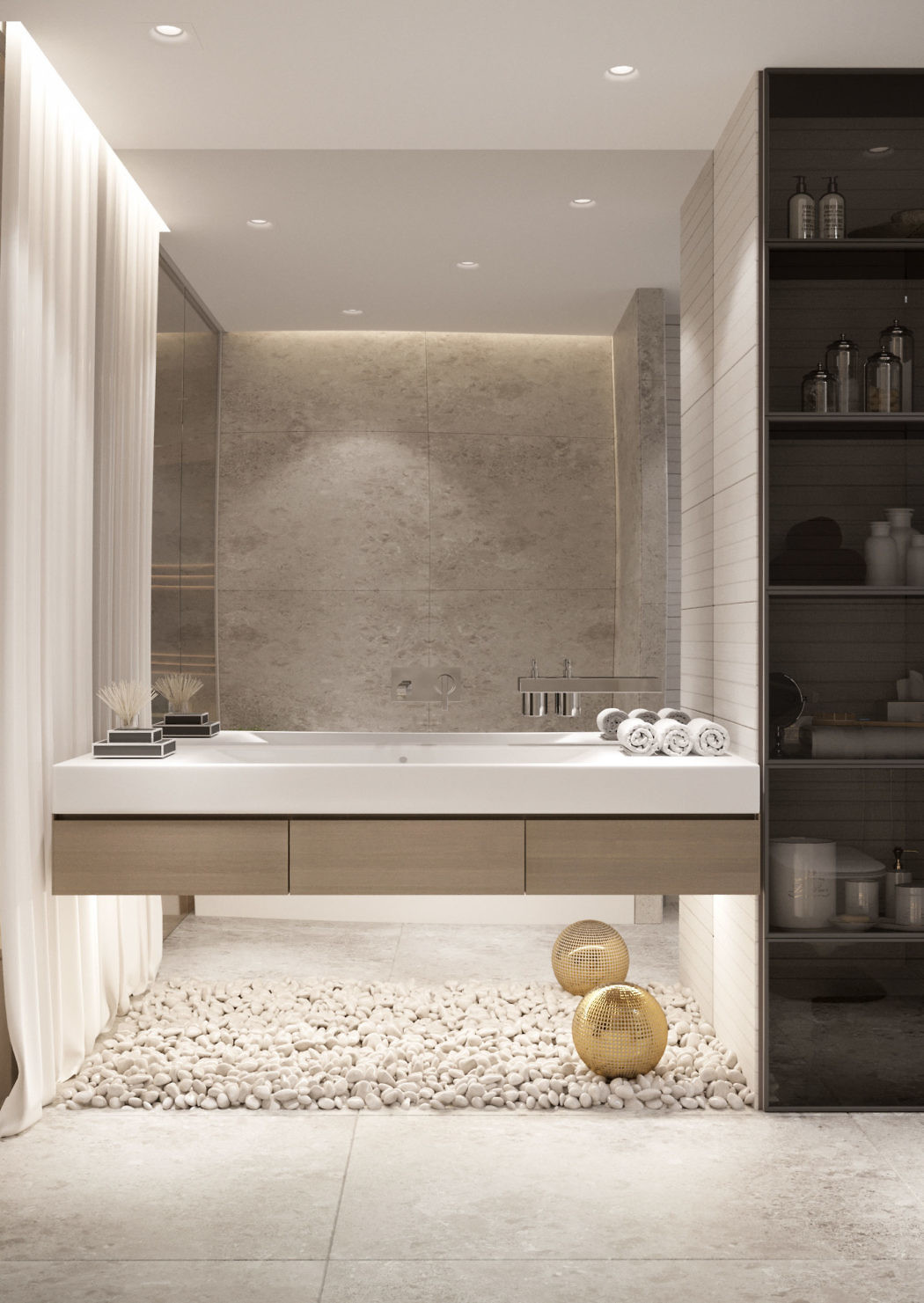Each bathroom exudes a unique character, from the crisp, geometric lines of one to the rain shower’s pebble-strewn floor of another. Materials intersect with intent, creating a canvas of textures and hues that celebrate modern design’s quiet complexity.