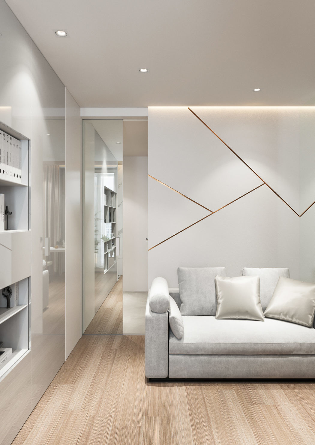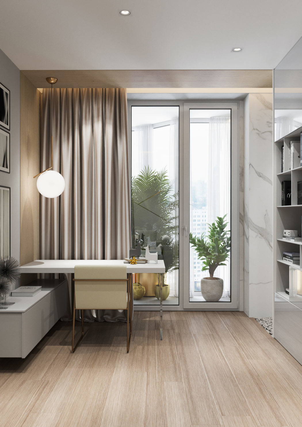 Flowing from the social hub, the study presents a tranquil retreat. Here, productivity and peace coexist, with a tailored workspace that overlooks the city’s pulse. A golden glow from tasteful lighting complements the muted palette, reflecting a harmony of design and purpose.