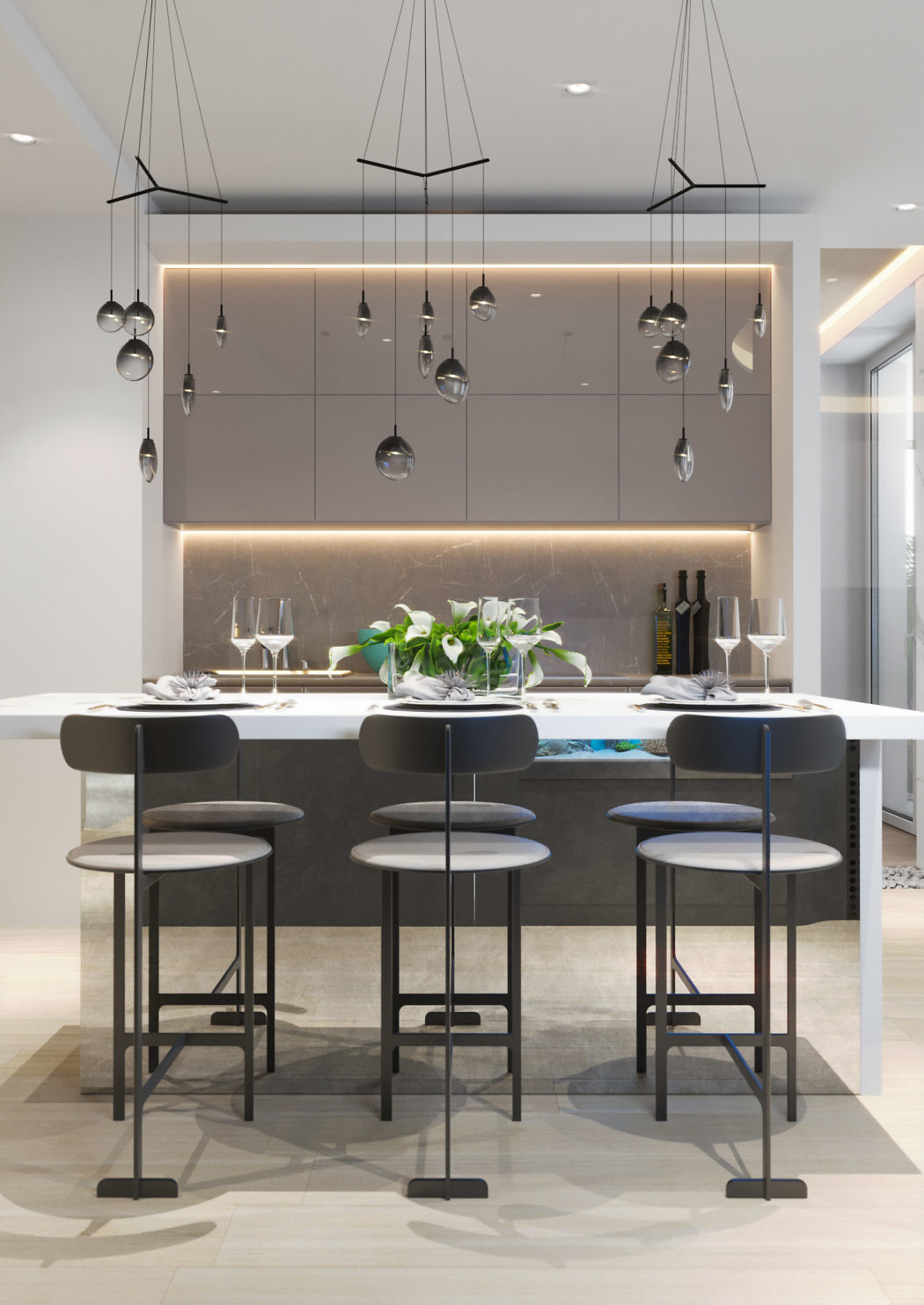 The narrative culminates in the entrance hall, where bespoke lighting casts intricate shadows, foreshadowing the apartment’s architectural dialogue. This space marks a threshold, one where form and function serve as silent sentinels to the world beyond these walls.