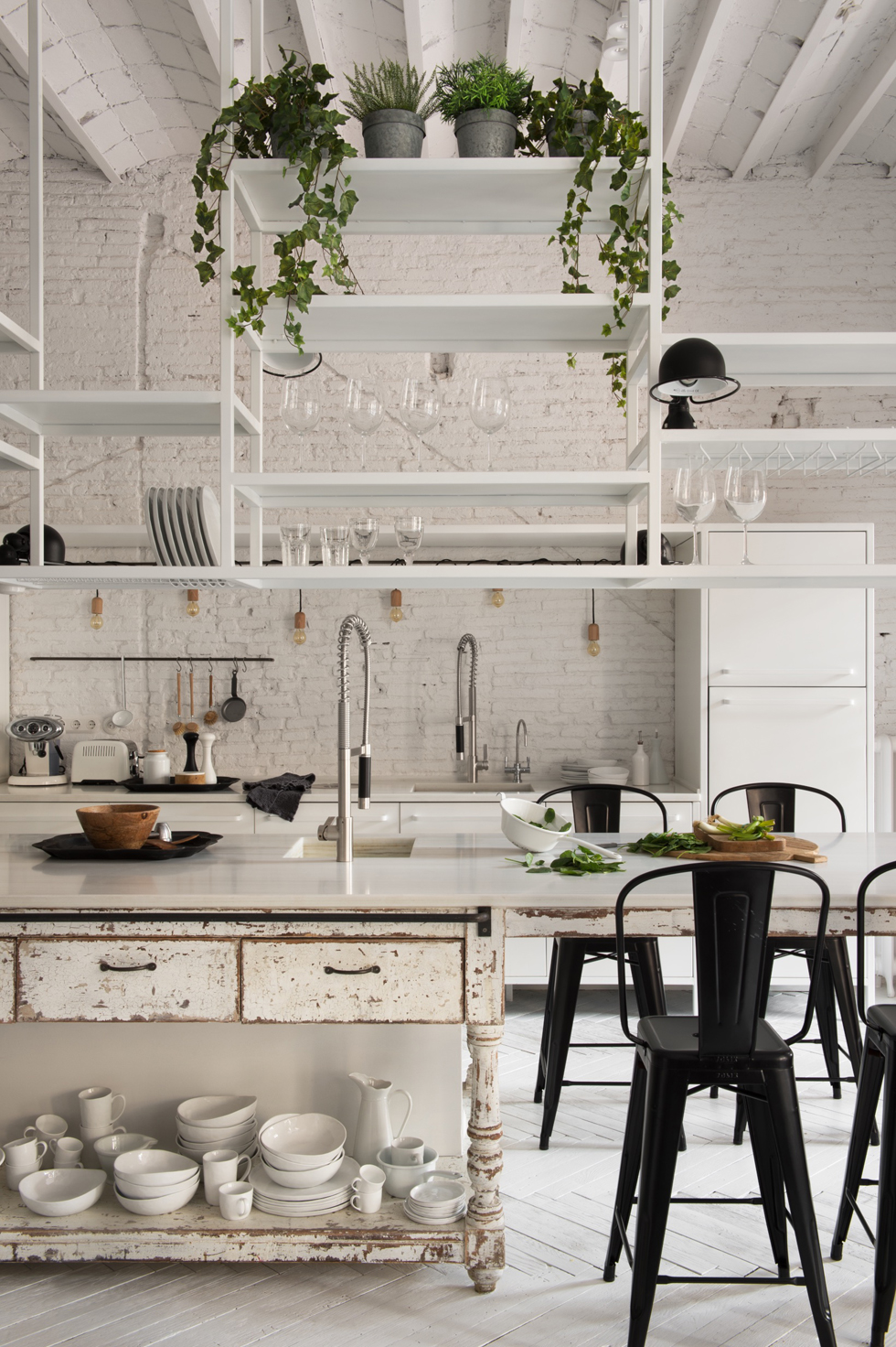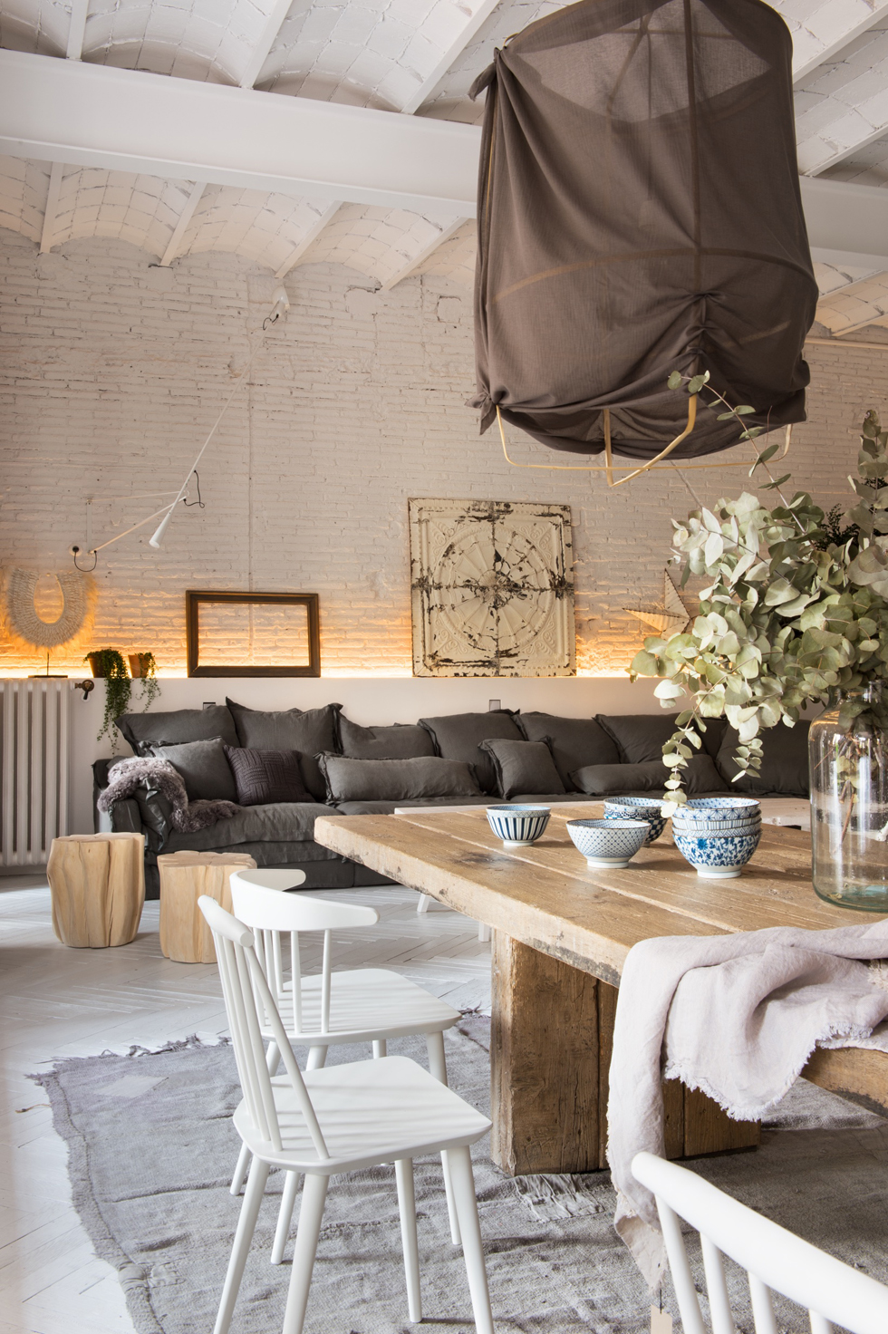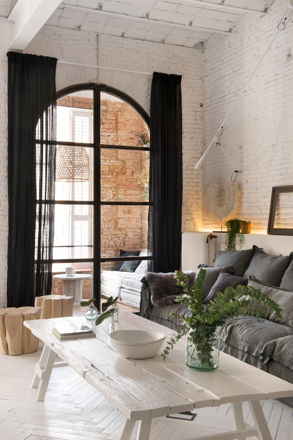 Upon entry, one’s gaze is immediately drawn to the open-plan living room, where exposed white brickwork and wooden beams overhead whisper the building’s history. A dark, plush sofa offers a stark contrast to the whitewashed surroundings, asserting the room’s grunge aesthetic. Here, Castellano balances raw textures with cozy comforts.