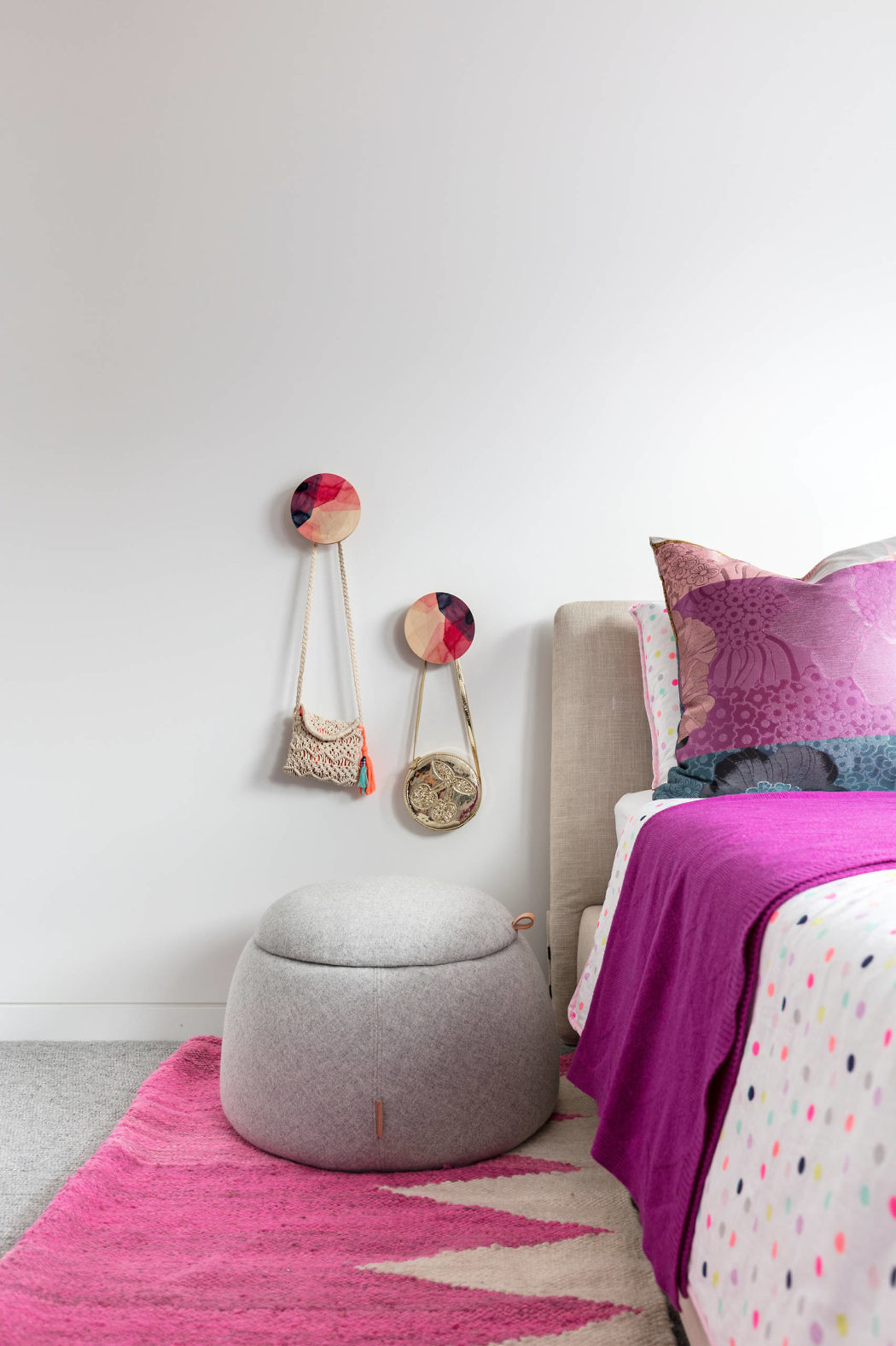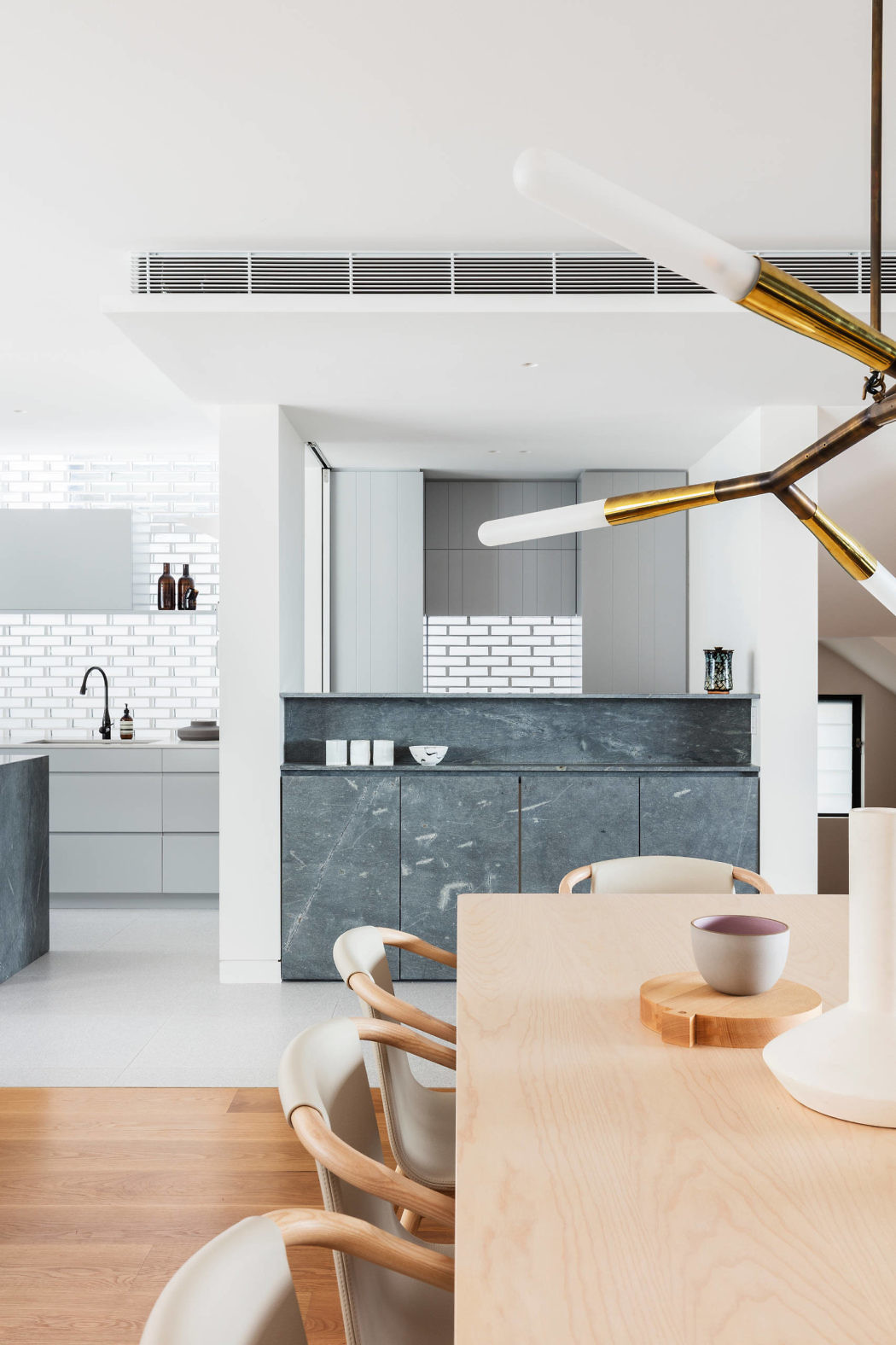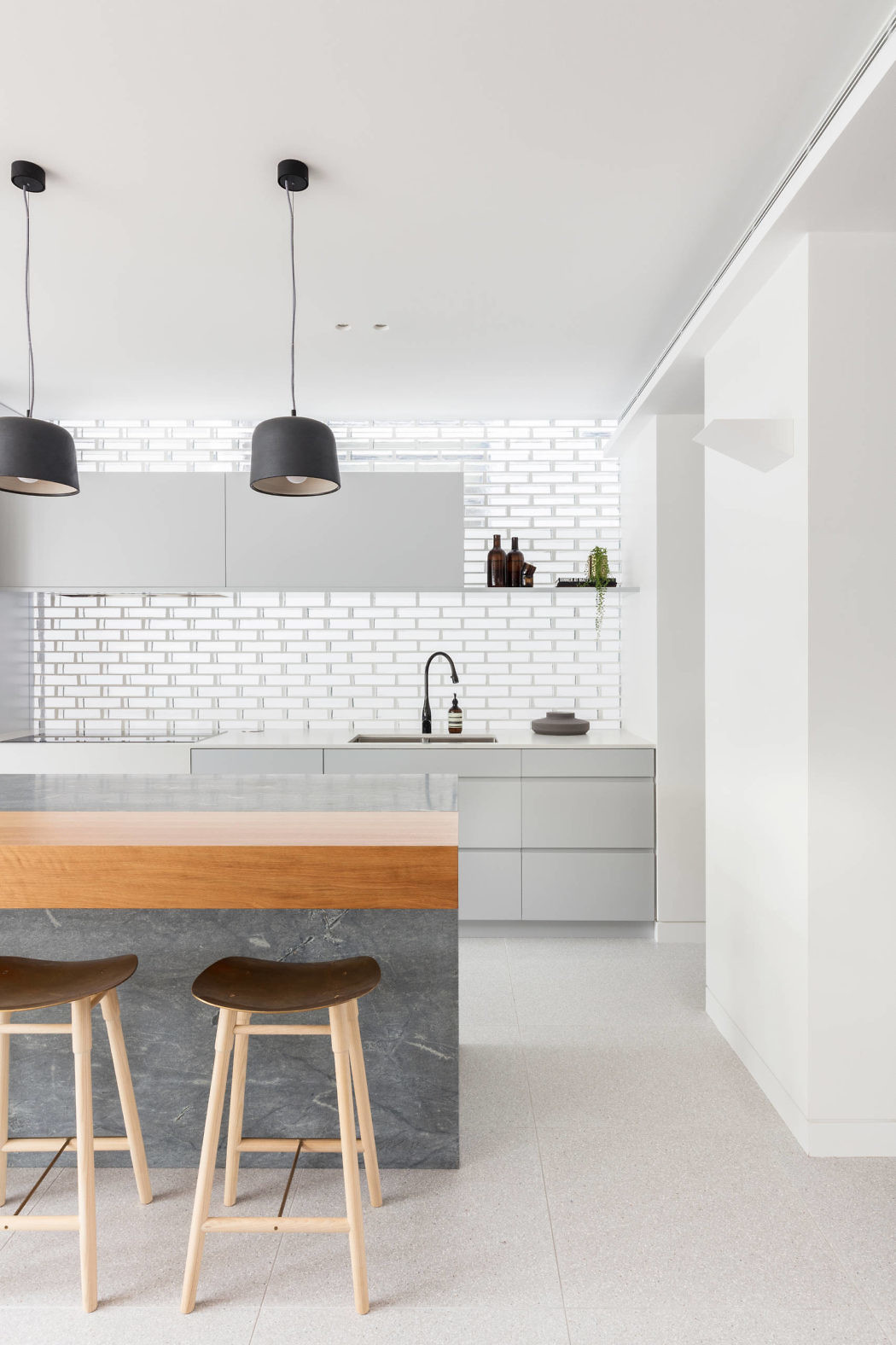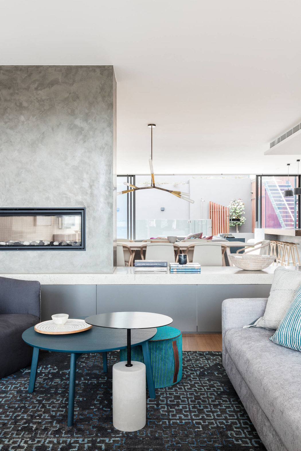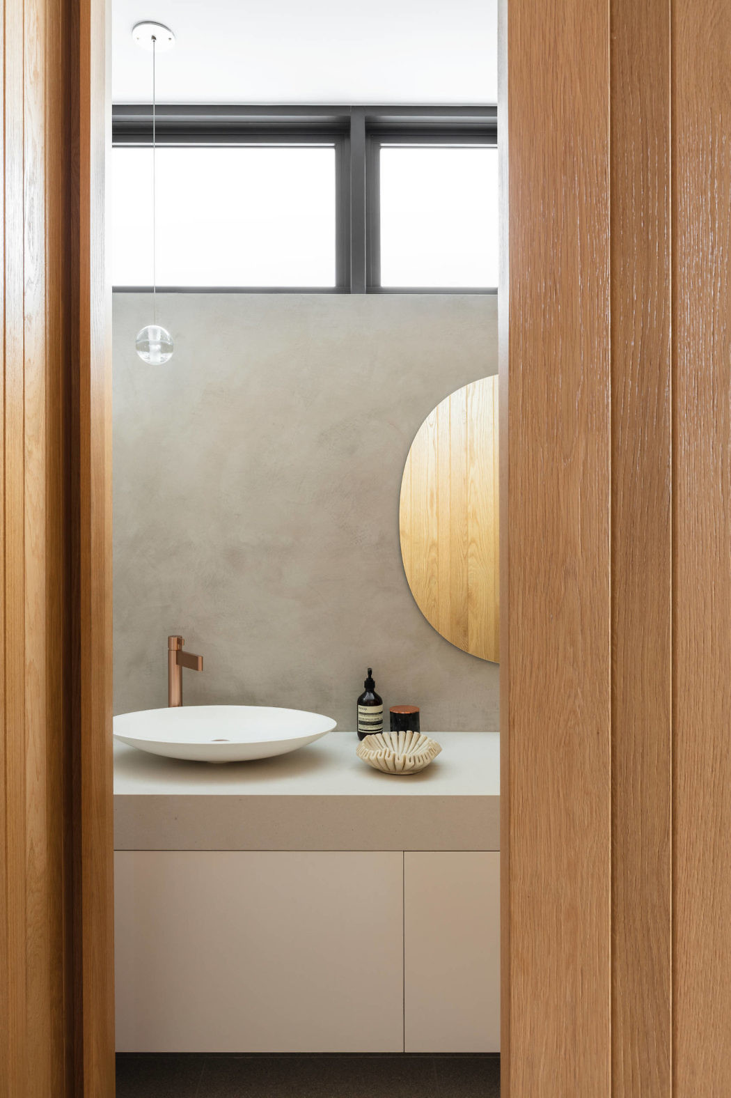 As you move through the space, an innovative hit-and-miss wall guides you to the main living area, kitchen, and dining space. This design choice cleverly provides tantalizing glimpses into the semi-private secondary living space. Meanwhile, the repetition of glass bricks not only ensures transparency but also bathes the space in a soft, diffused light. Additionally, the vertical textured oak timber walls serve as a stunning backdrop, enhancing the home’s playful, colorful decor that mirrors the clients’ vibrant personalities.