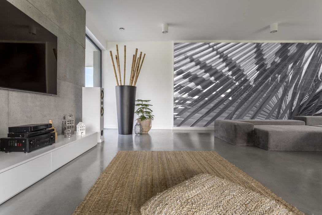 Step inside and the living room greets you with an open, airy space, marked by its oversized sofas that invite relaxation. The concrete fireplace, a central feature, anchors the room with its warmth, contrasting with the sprawling glass doors that offer views of the serene outdoors.