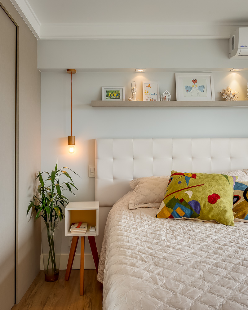 Transitioning from the expanse of the living room, the bedroom serves as a tranquil retreat. Here, the use of space is intentional—every element from the crisp bedding to the strategically placed reading light echoes the designer’s vision. Neutral tones and textures whisper relaxation, while the curated shelf above the bed displays a personal touch.