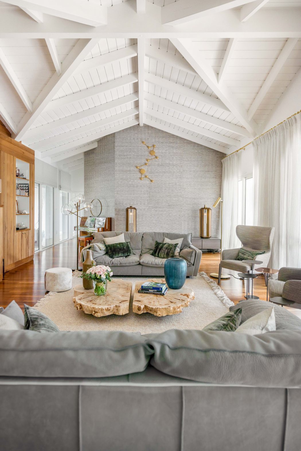 A glance through the dining area reveals a living room that echoes the harmonious blend of wood and soft textiles. The eye is drawn to the vaulted ceilings, adding airiness to the room. A stone fireplace anchors the space, offering warmth and a focal point that embodies Refuge’s signature style.