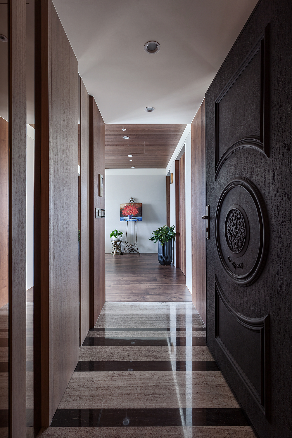 The journey inward reveals a sleek, multi-functional space that doubles as a home office and a portal to an intimate walk-in closet. The design harnesses the beauty of simplicity, marrying clean lines with practical elegance.