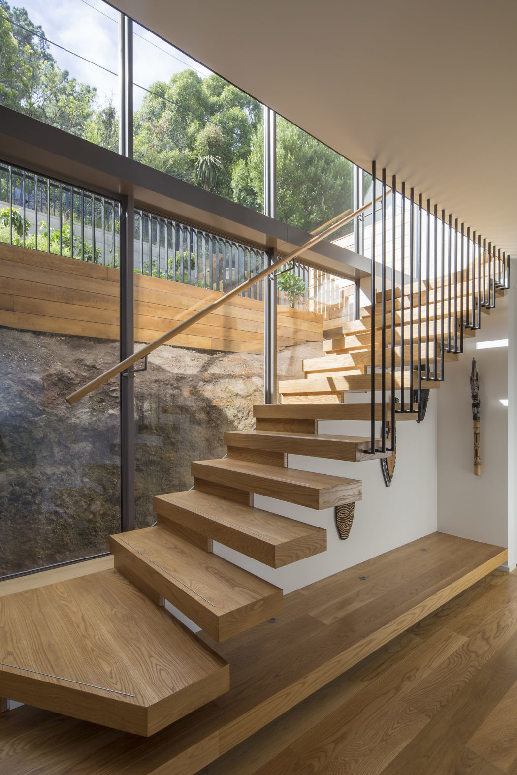 Approaching Scarborough House, the first encounter is with its innovative exterior. The steel and glass façade, punctuated by wooden slats, yields expansive views and a striking first impression. Sunlight dances off the metal roof, hinting at the thoughtful interplay of light and shadow crafted by the architects. The dwelling’s sturdy base, anchored in the hillside, offers a sense of permanence amidst the fluid ocean panorama.