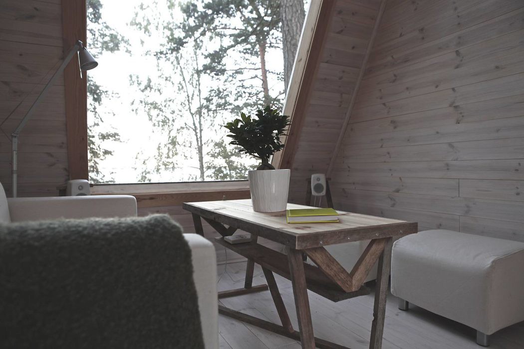 Scandinavian style interior with wooden walls and a simple desk by a window.