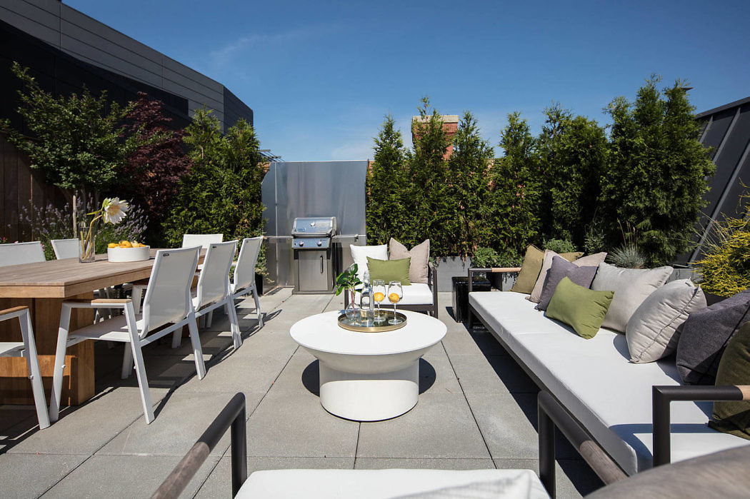 Transitioning to the outdoors, the terrace is a green oasis. Lush plantings frame the space, where sleek, minimalist furniture offers a tranquil escape. Here, gatherings flourish beside a state-of-the-art grill, set against the vibrant skyline—a testament to the apartment’s design acumen, blending indoor elegance with outdoor allure.