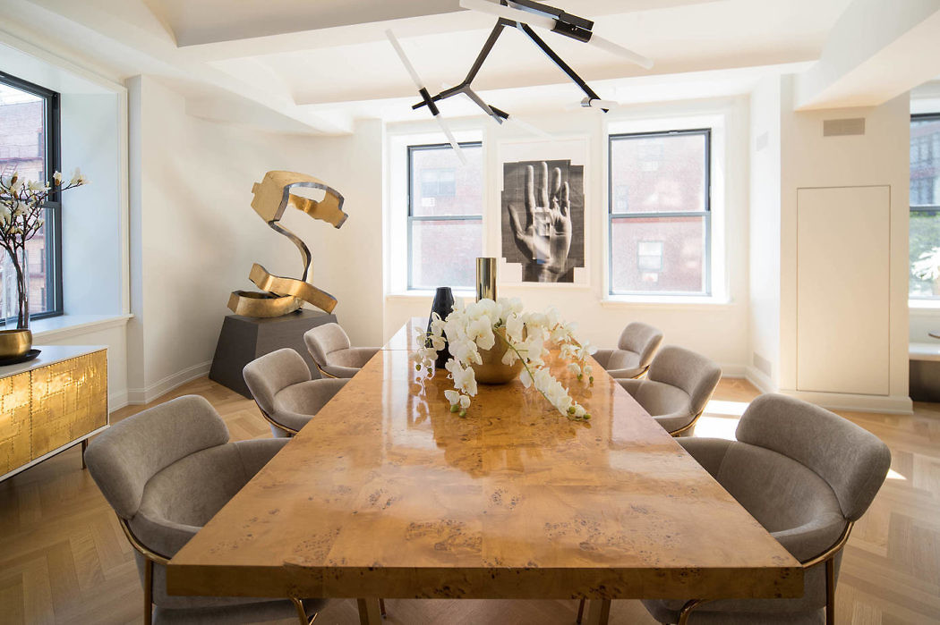 The journey concludes in the dining room, where a bold table serves as the centerpiece, surrounded by plush seating. An artistic light fixture stretches above, casting a soft glow over intimate dinners and vibrant conversations. This space encapsulates the essence of The Shephard—where contemporary design meets timeless New York City elegance.