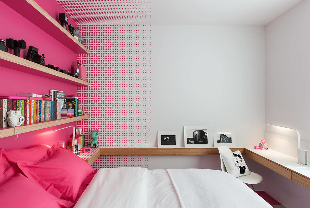 Inside, the living room becomes a canvas for commissioned artwork, where vibrant colors leap from the walls against a backdrop of crisp, clean lines. Wood panels and custom millwork conceal practical storage, while maintaining a fluid aesthetic. Moving through the space, each room introduces its own character, from the playful dynamism of a pink-hued bedroom to the serene symmetry of the bathroom.