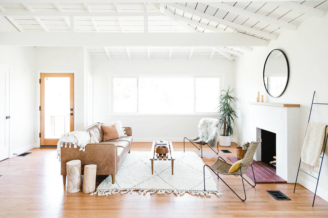Transitioning indoors, the living room awaits with a palette of white and earth tones. Exposed beams traverse the ceiling, drawing the eye to the centrally placed circular mirror above the fireplace. Here, modern furnishings juxtapose with rustic elements, creating a balanced haven.