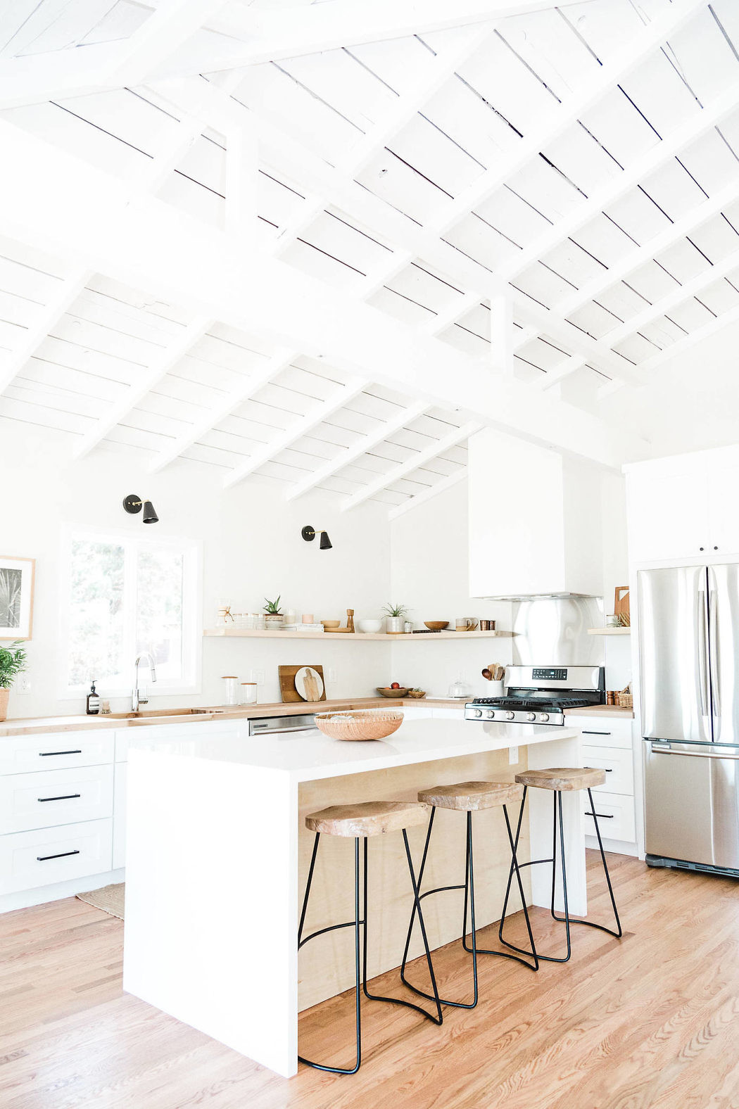 The journey culminates in the kitchen, where functionality meets aesthetics. White cabinetry, paired with wooden countertops and open shelving, reinforces the bungalow’s airy ambiance. Adjacent, the dining area fuses seamlessly with the living room, solidifying the open-concept layout that defines this home.