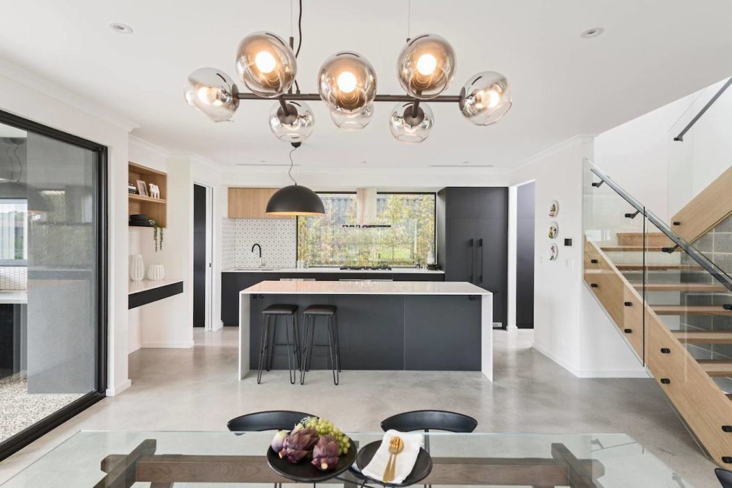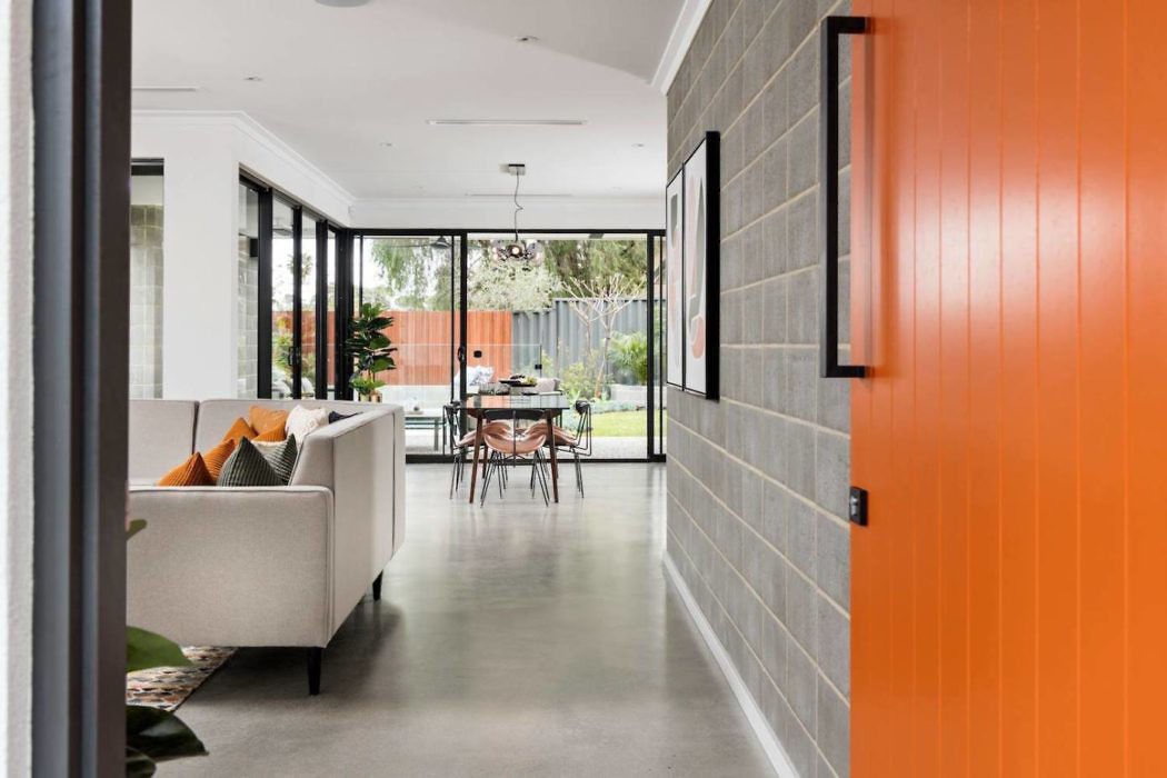 Through expansive glass windows, the boundary between inside and out is effortlessly blurred. The open-plan living area extends a warm welcome, with natural light illuminating the sleek, polished concrete floors—a testament to the home’s seamless design.