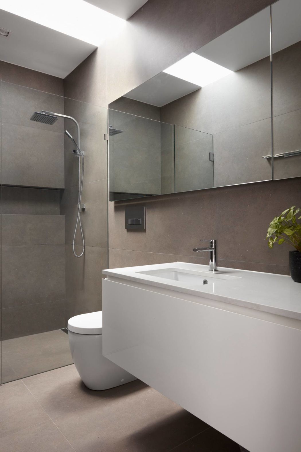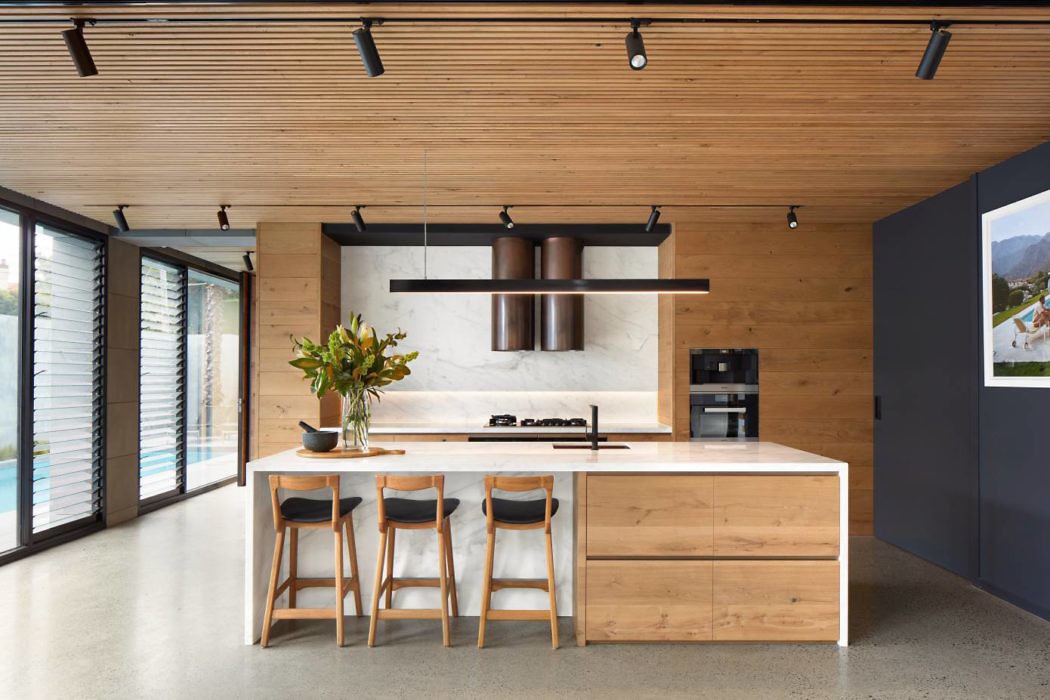 Above, a double-height void over the dining area allows light to cascade into the home’s core. This void also connects to the first-floor bedrooms. Inside, the dominance of bluestone necessitated an interior palette that softens and complements the exterior. Light timber finishes on stair balustrades and ceiling battens achieve this balance.