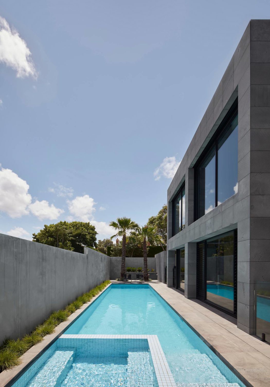 The house features a refined palette of bluestone, powder-coated steel, and timber-clad soffits. This design choice enhances the bluestone’s natural qualities. The grid-clad exterior, emphasizing vertical and horizontal lines, gracefully masks the concrete substructure. Consequently, the aged appearance of the materials integrates the new structure into its context, exuding a timeless aura.