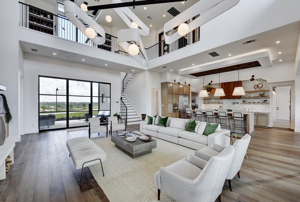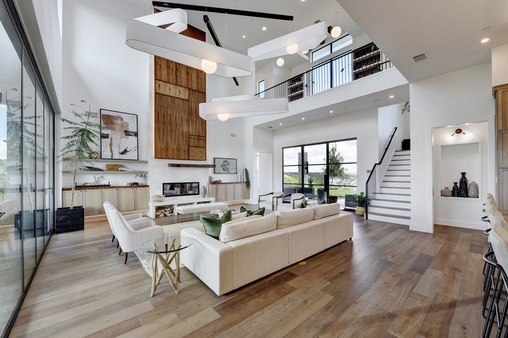 The home’s unique feature is its full stacking glass doors at the back, complemented by a wall of glass doors at the front. This design invites light and air, creating a breezy, beachfront ambiance in the gathering room. The room’s 24-foot-tall ceiling (7.3 meters) posed a challenge, especially in lighting the tall fireplace wall effectively. After exploring various designs, Moonshine Shades from south Austin brought our vision to life. They crafted a stunning, 14-foot by 14-foot (4.3 meters by 4.3 meters) moving mobile chandelier with 8-foot shades (2.4 meters), evoking images of floating clouds.