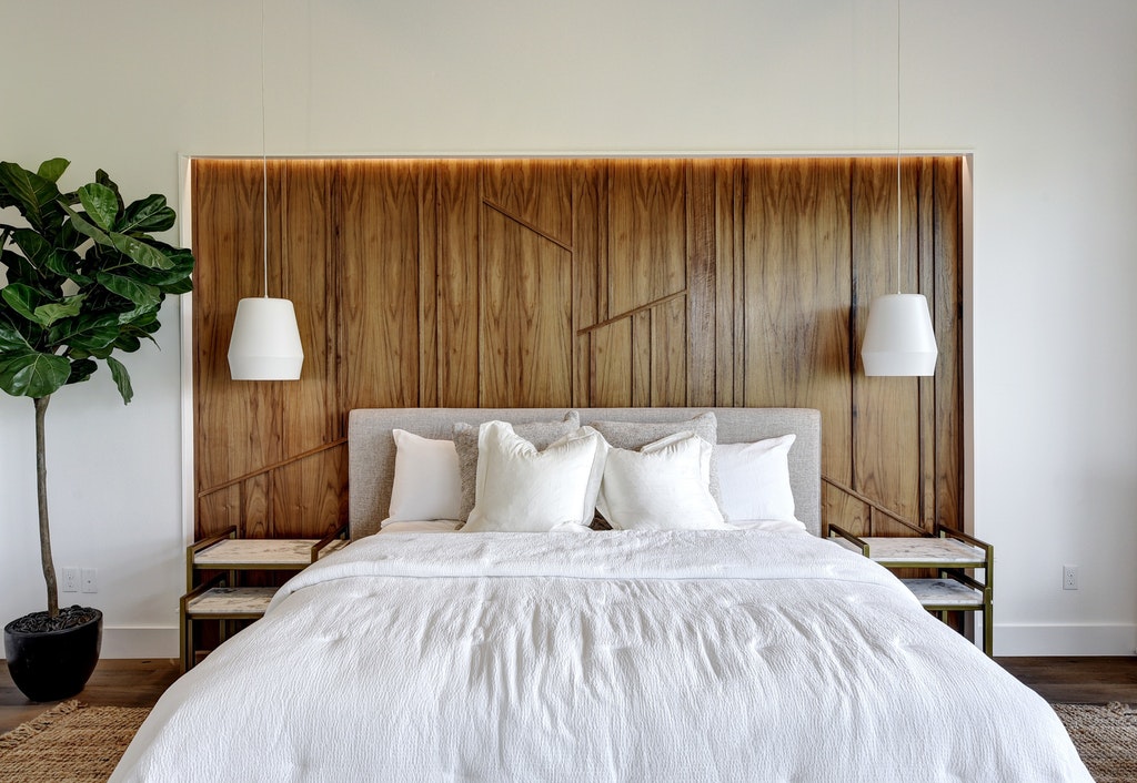 To complement the home’s airy vibe, I designed walnut panels with intricate details for the house, including the tall fireplace wall. These panels added warmth and texture, balancing the light fixture’s airiness. The contemporary lighting throughout the house contrasts with the walnut’s warmth, enhancing the cozy atmosphere. We mixed wood tones, pairing white oak cabinets with a gray wash alongside solid walnut countertops and a custom vent hood, creating a diverse, forest-like feel.