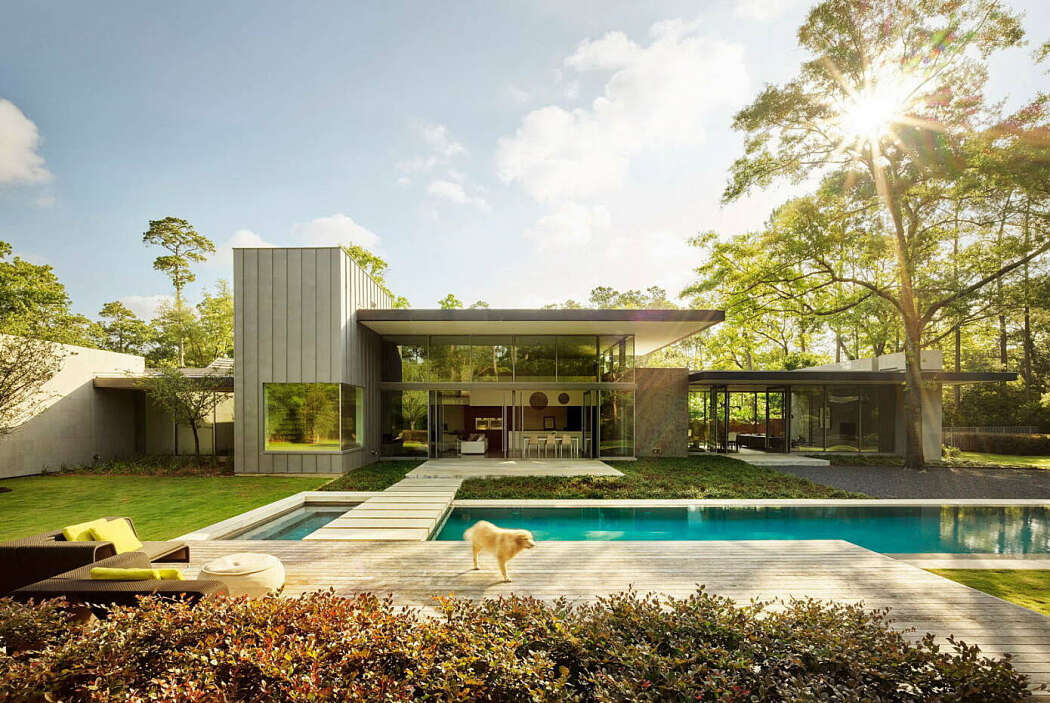 In an exclusive neighborhood known for traditional homes, a professional couple acquired a two-acre (0.8 hectares) wooded site. Their vision: a modern residence that embraces California-style indoor-outdoor living, adapted to Houston’s challenging climate.