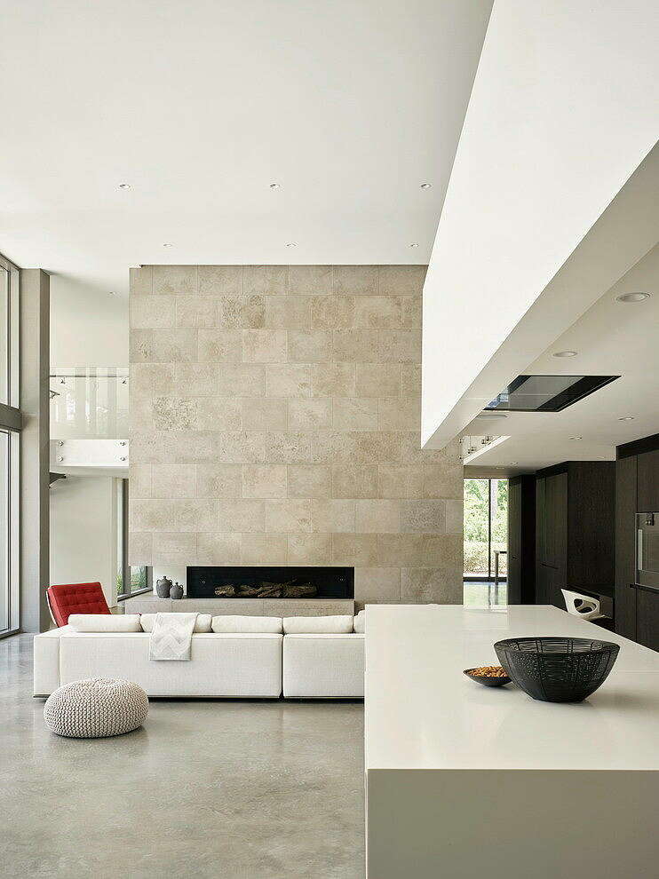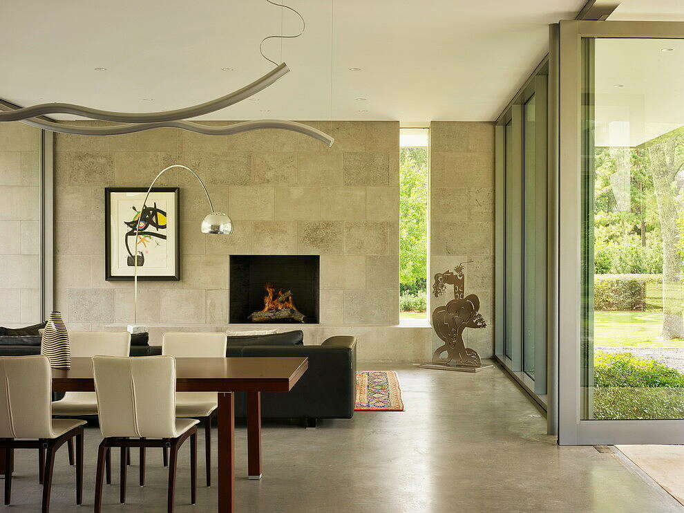 Kuhlman Road House is a modern home by Ehrlich Yanai Rhee Chaney Architects providing California-style indoor-outdoor living, and creating strong connections to the outdoors with large expanses of glass interspersed with limestone masses.