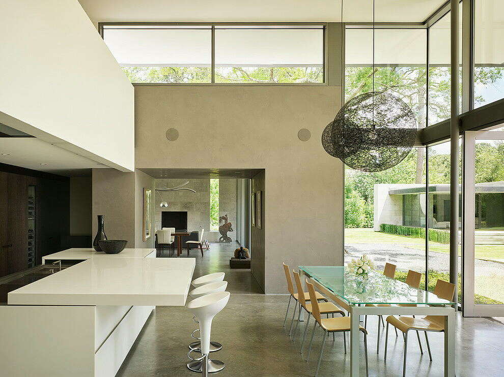 The house combats Houston’s hot, humid summers and wet winters through deep roof overhangs and slatted sunscreens that protect the glazed areas. The material palette includes Texas limestone and Rheinzink, complemented by poured concrete floors and bespoke back-painted glass cabinets indoors.