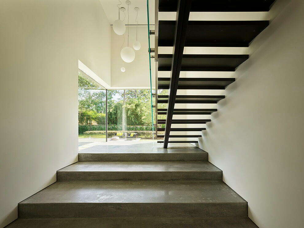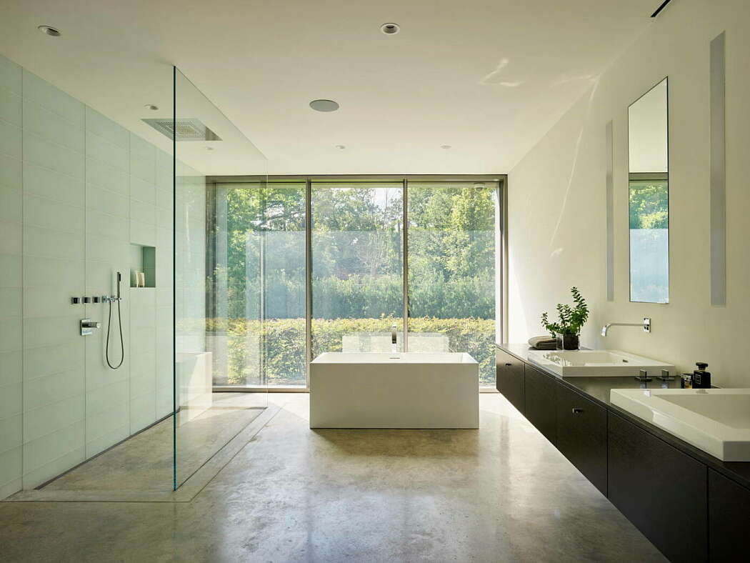 At the entrance court, a striking Rheinzink wall transitions into garage doors, separating guest parking from the main house. This design choice ensures tranquility throughout the house and gardens, maintaining a serene living environment.