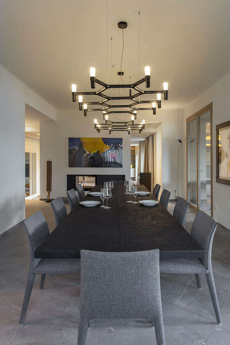 The dining room, a canvas of refined taste, boasts a grand table where guests convene under the soft glow of an artistic light installation, enhancing the room’s modern flair.