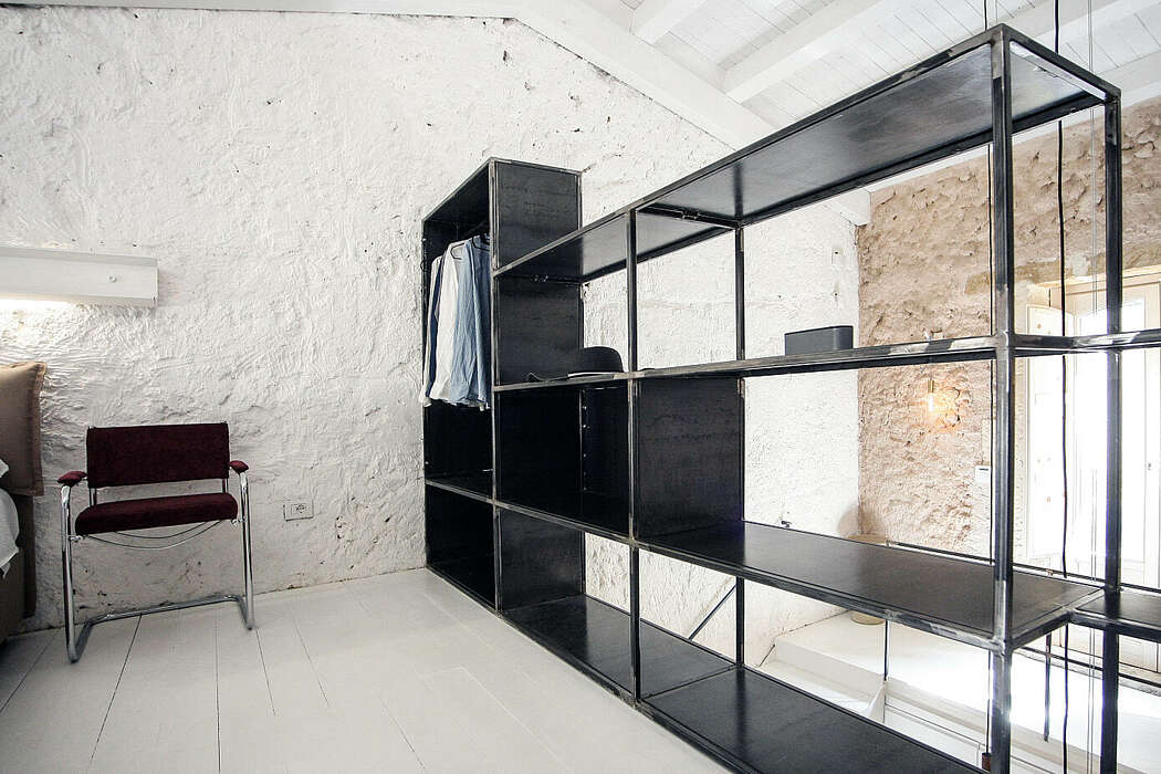 Preserving its historical essence, the loft maintains its original dual entrances. On the first level, an island now hosts the kitchen, alongside a dining area, living room, and a bathroom with shower and tub. Furthermore, the second level unfolds into a sleeping area, an extra bathroom, and the alluring “Arab terrace.” Significantly, the exterior walls remain exposed, adorned with a thin lime layer. The roof, reimagined with a pitch design, incorporates micro-ventilation between the wooden plank floor, insulation, and iconic Sicilian tiles. Moreover, the first level sparkles with a micro-resin floor, and the mezzanine’s wooden beams are elegantly treated with white stains.