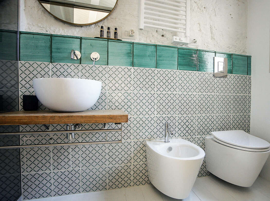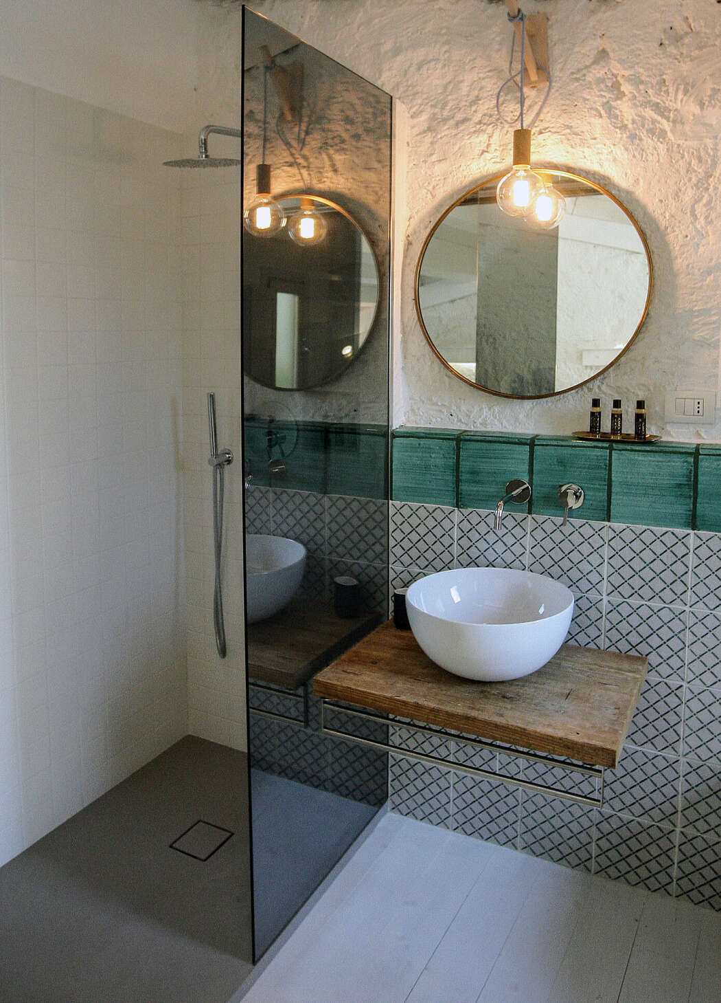 This renovation, under the couple’s directive, skillfully repurposed many old elements. Notably, cement tiles adorn one entrance, resembling a carpet. Additionally, the original front door finds new life in the ground-floor bathroom. Traditional ceramics, used as wall coverings in the second-level bathroom, further echo Sicilian heritage. Finally, the stone washbasin and green copper floor on the terrace uniquely fuse traditional materials with contemporary design, culminating in a space that respects and revitalizes Sicilian traditions.