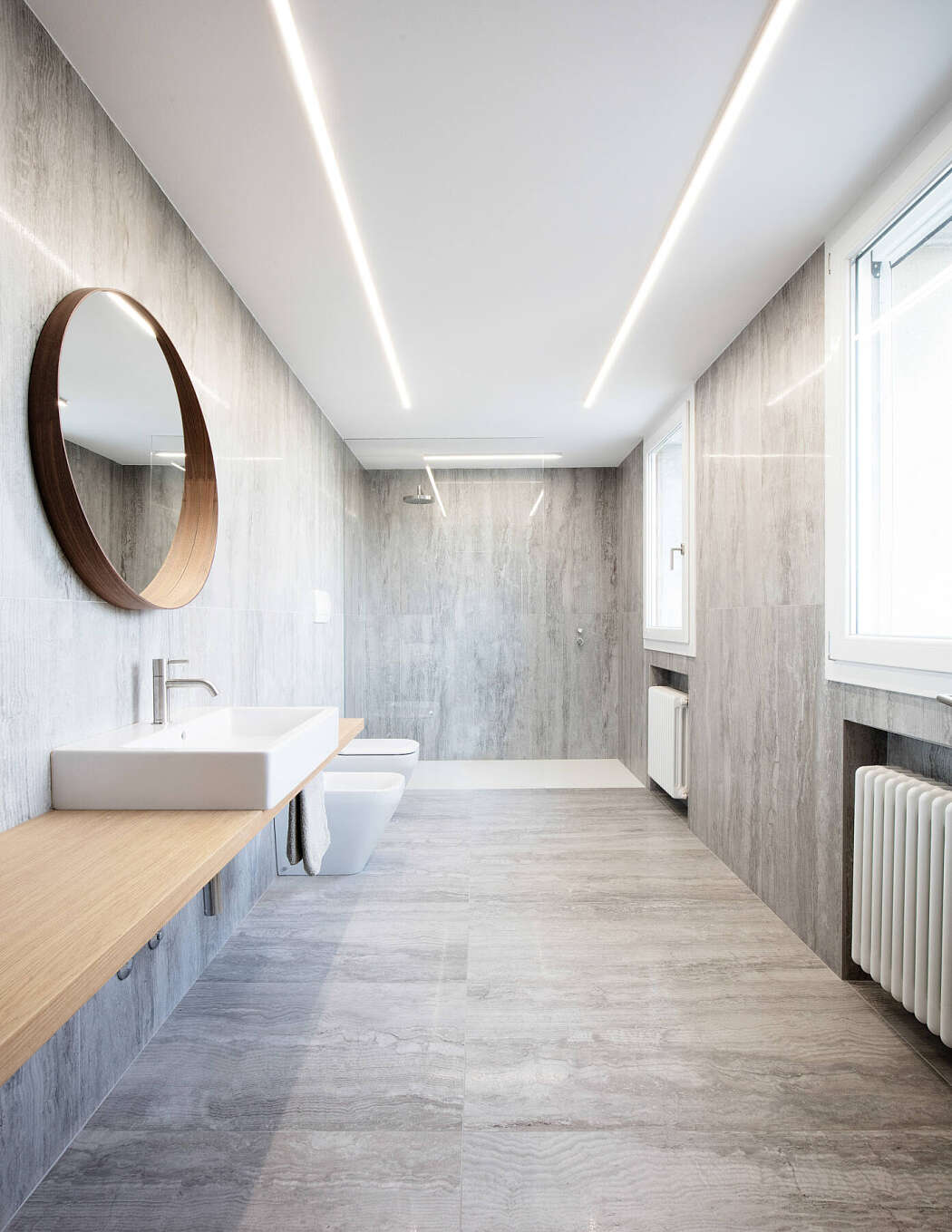 Above, the master bedroom reprises the material palette from below, ensuring visual continuity, while the bathroom’s gray stone stoneware (extending to the floor) achieves material uniformity. Also, a wooden shelf adds a linear dynamic, stretching toward the spacious niche shower.