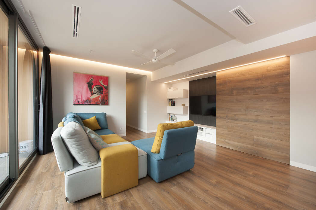 For the living room, we made a sunny, flexible area with easy-to-move sofas. This setup allows families to reshape the room for gatherings. Next to this, you’ll find the kitchen and dining space. What stands out? A mix of cool industrial vibes from black iron plates and a cozy bar separated by wooden slats. Plus, the kitchen’s white shade not only boosts light but also blends well with other materials.