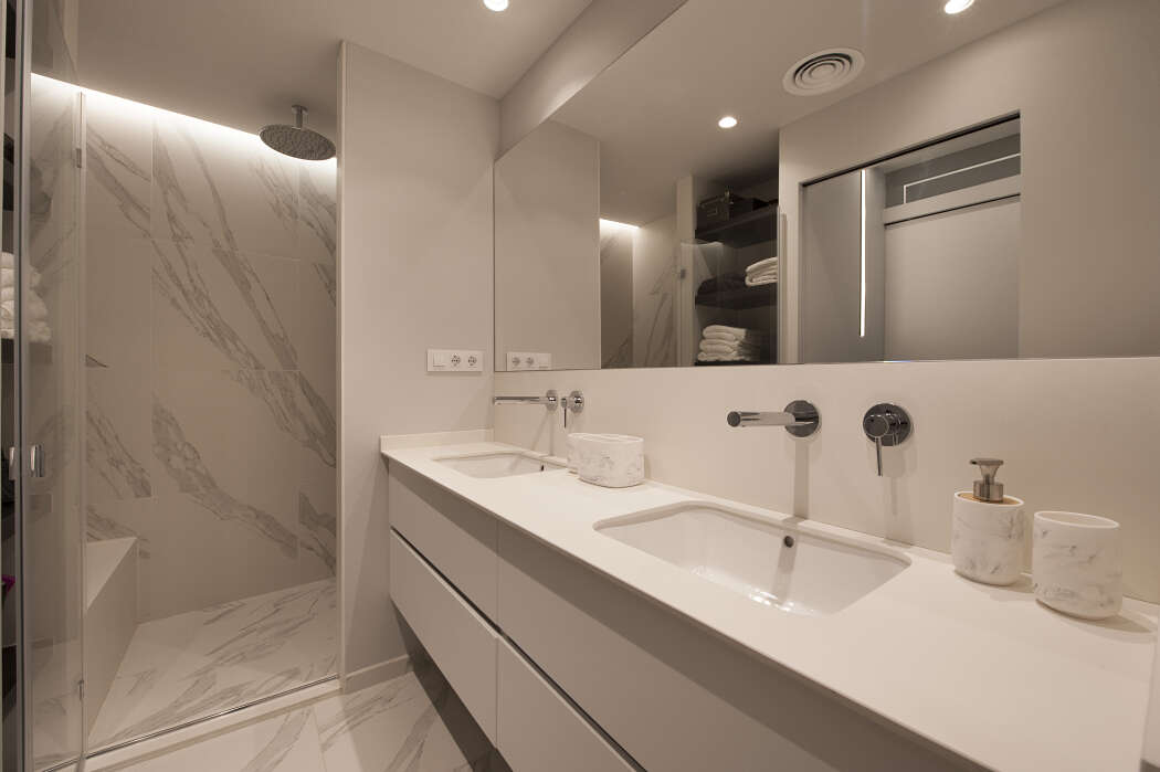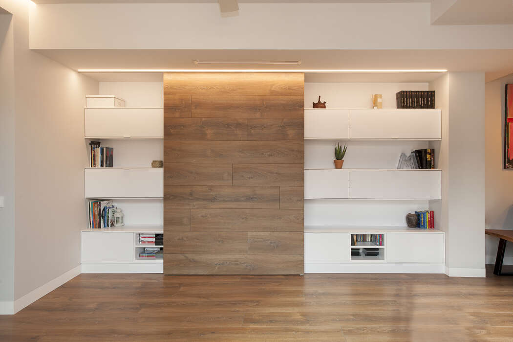 The day area neatly divides the kids’ rooms from the main bedroom, giving everyone their own space. Beside the main bedroom, there’s a roomy bathroom. We chose white for its furniture and surfaces, giving off a clean, fresh feel. And even though it doesn’t have windows, the white makes it feel bright. Also, there’s a hidden laundry spot, neatly tucked away behind foldable doors.