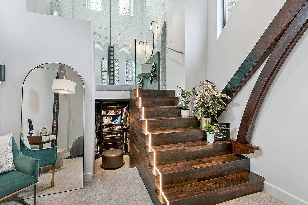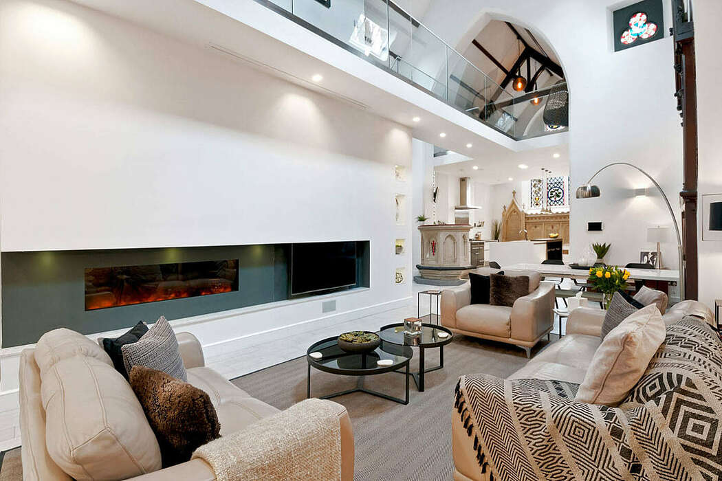 Despite its age, this church boasts cutting-edge technology. From touchscreen controls and ceiling speakers to a retractable 50″ widescreen with 5.1 audio, this home redefines modern luxury. Energy-efficient lighting, smart thermostats, and advanced security systems further accentuate its contemporary vibe. Holbrook Electrical, our sister company, seamlessly integrated all electrical and AV systems.